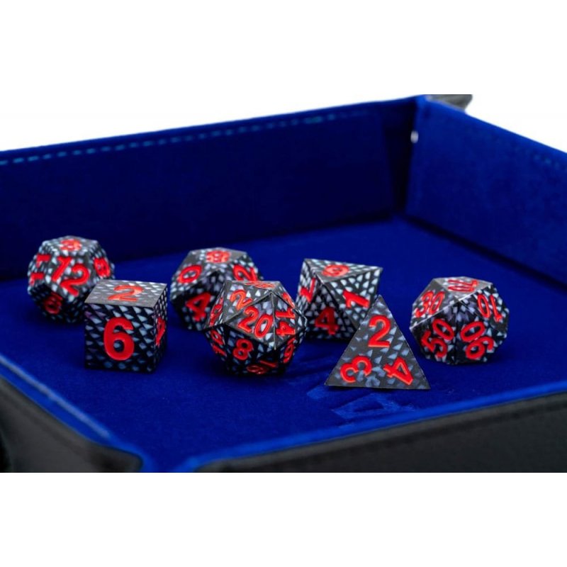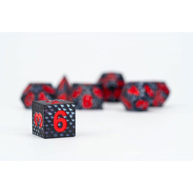 A new line of dice perfect for any tabletop adventurer! The new silicone Dragon Scale die features new technology to look and feel like Dragon Scales!Sharp Edge Silicone Rubber dice are fun and unique to roll. Sharp edges provide a precise roll that is complemented with the slight bounce of silicone. Each full-sized, 16mm set comes with 7 dice (d4, d6, d8, d10, d10% (00-90), d12, and d20).Contains: 7 dice