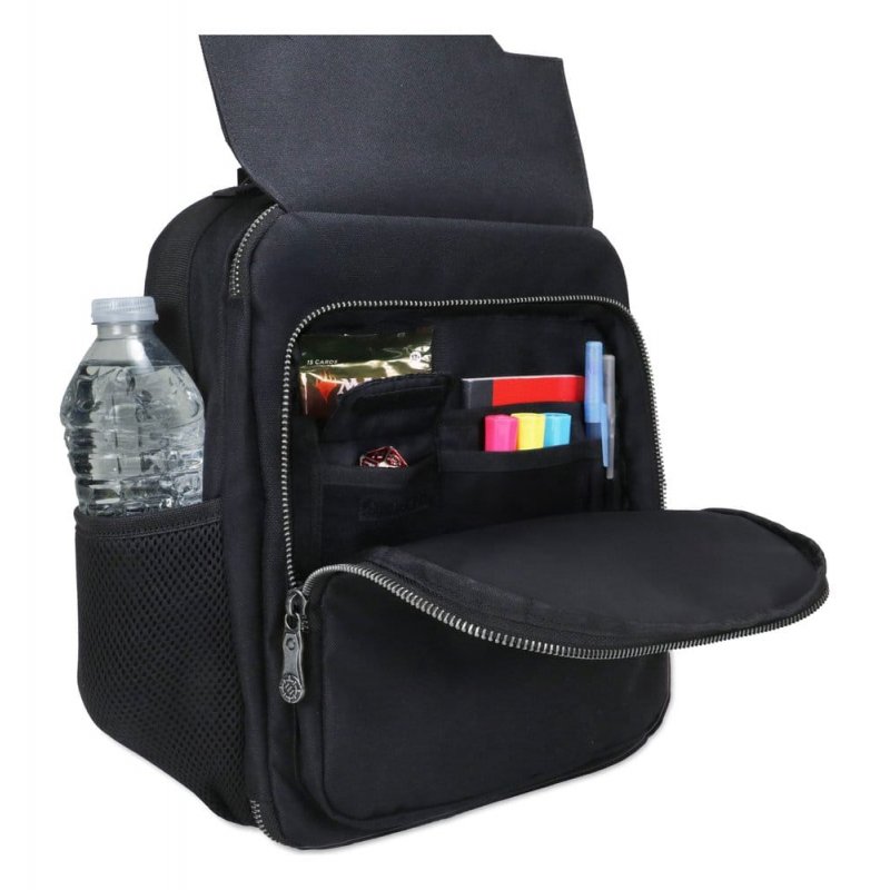 Bring your best to your next tournament or game night with the Enhance Backpack. - Spacious interior - Capacity: Up to 2 400-Count cardboard boxes - Storage: For cards, deck boxes, loose sleeved cards, or other accessories - Collector's Edition: Highest-grade Dragon Scales material and metal charm keychain