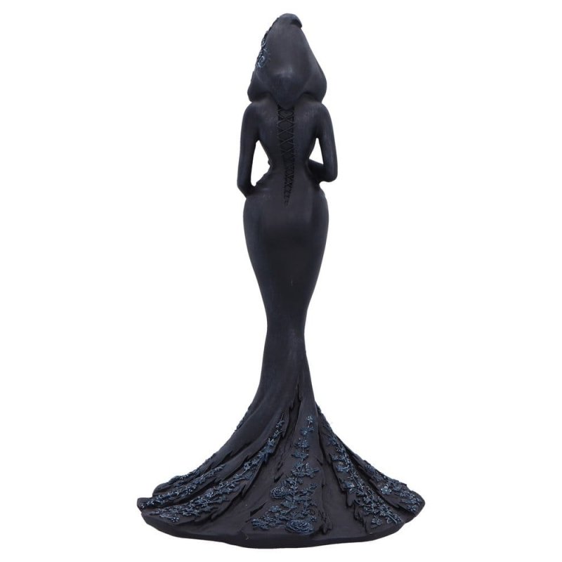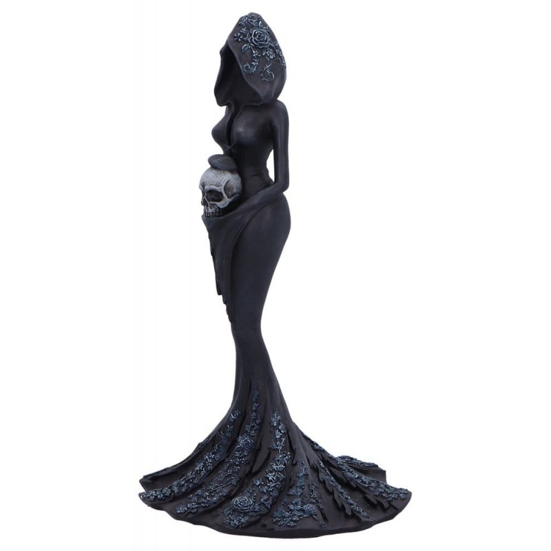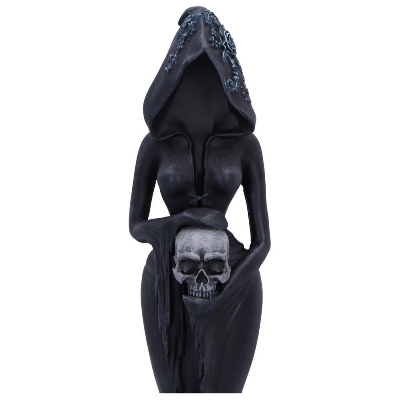 A captivating gothic figurine depicting a faceless, hooded woman delicately holding a skull, an original design from Nemesis Now. Expert resin casting, a matte black finish, and elegant flower accents on the flowing robe. Packaged in a full colour branded window box, ensuring it’s protected and ready for immediate display or gifting. Perfect for gothic art collectors, fantasy enthusiasts, and lovers of dark, feminine symbolism.- Hand-painted - Material: Resin - Height: approx. 20 cm