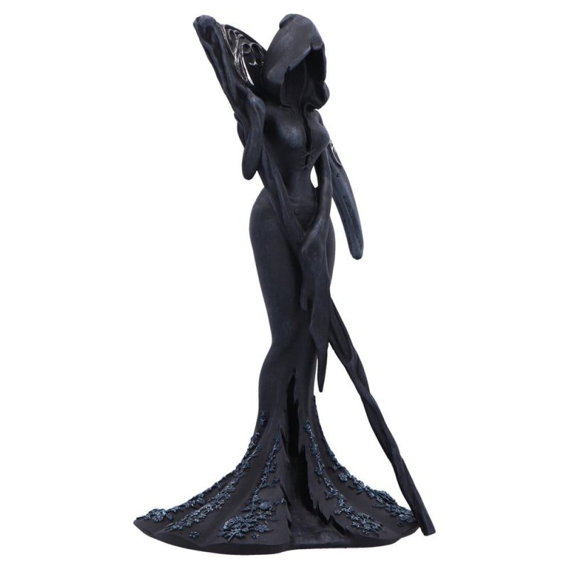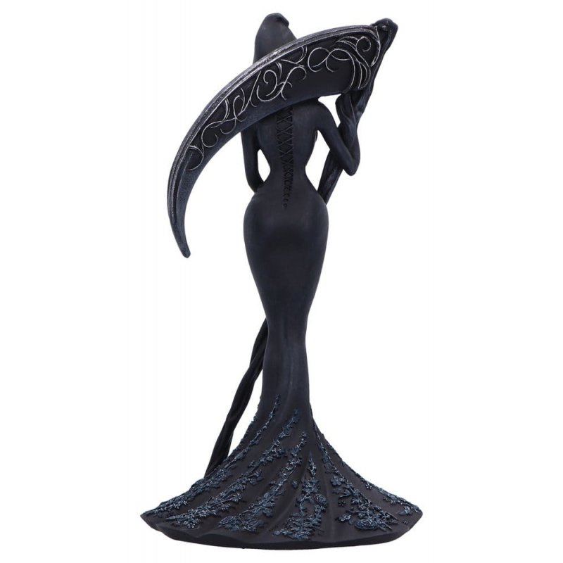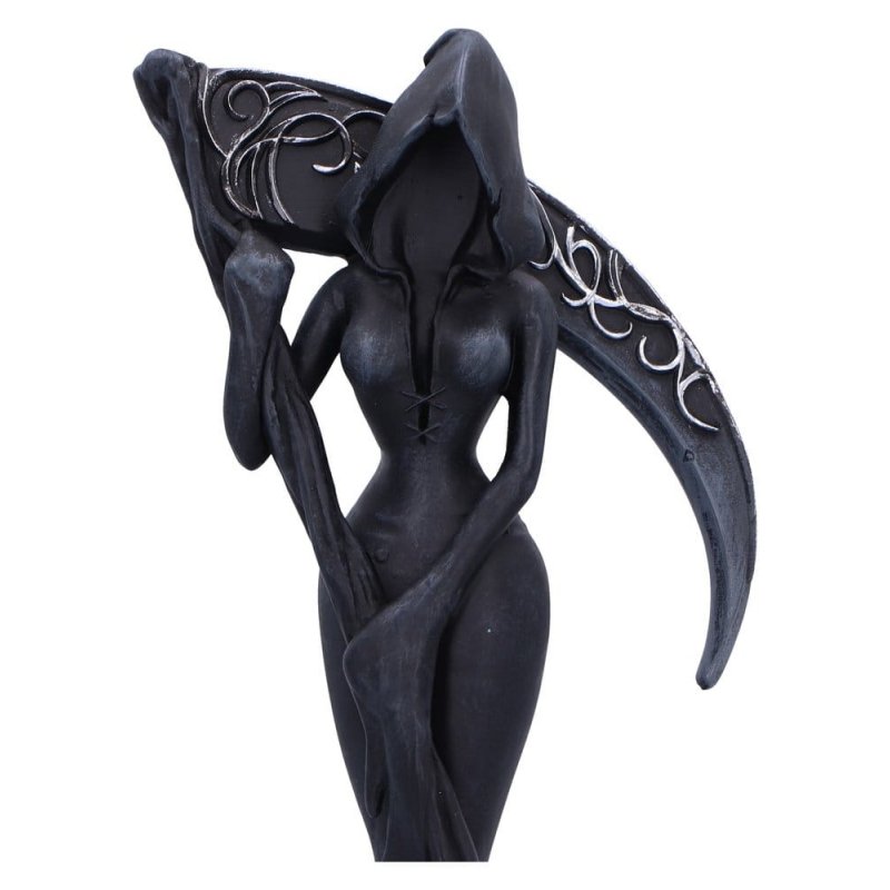 A hauntingly elegant figurine depicting a faceless, hooded woman wielding a scythe. A finely sculpted resin body, finished in matte black with a striking scythe, evokes mystery and power. Packaged in a branded window box, ensuring it arrives safely and ready for display or gifting. Great for collectors of gothic decor, fantasy fans, and admirers of dark feminine symbolism.- Hand-painted - Material: Resin - Height: approx. 20 cm