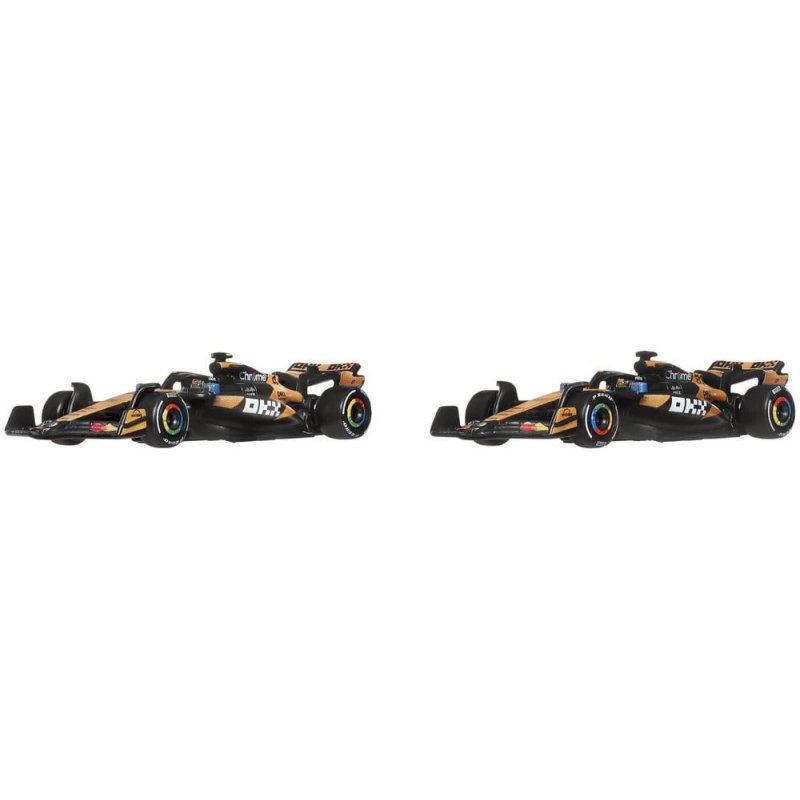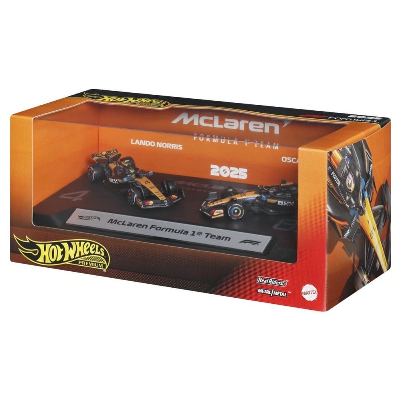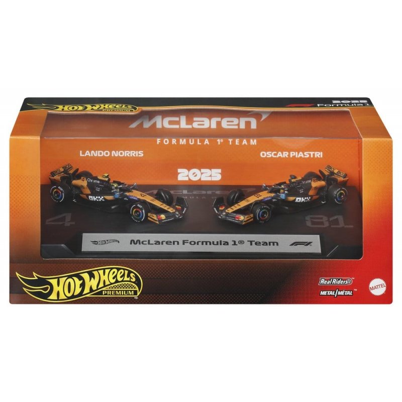 With this Hot Wheels Premium McLaren F1 Team 2-Pack, any Hot Wheels collection shifts into turbo gear. The set includes 1:64 scale die-cast race cars inspired by the models driven by Oscar Piastri and Lando Norris. Each car features authentic liveries with realistic front wings and side pods, as well as detailed driver helmets. The metal body and chassis, along with Real-Riders tires, highlight the high-quality craftsmanship of the cars. With special packaging and an individual display base, both drivers score points. Color and design may vary.