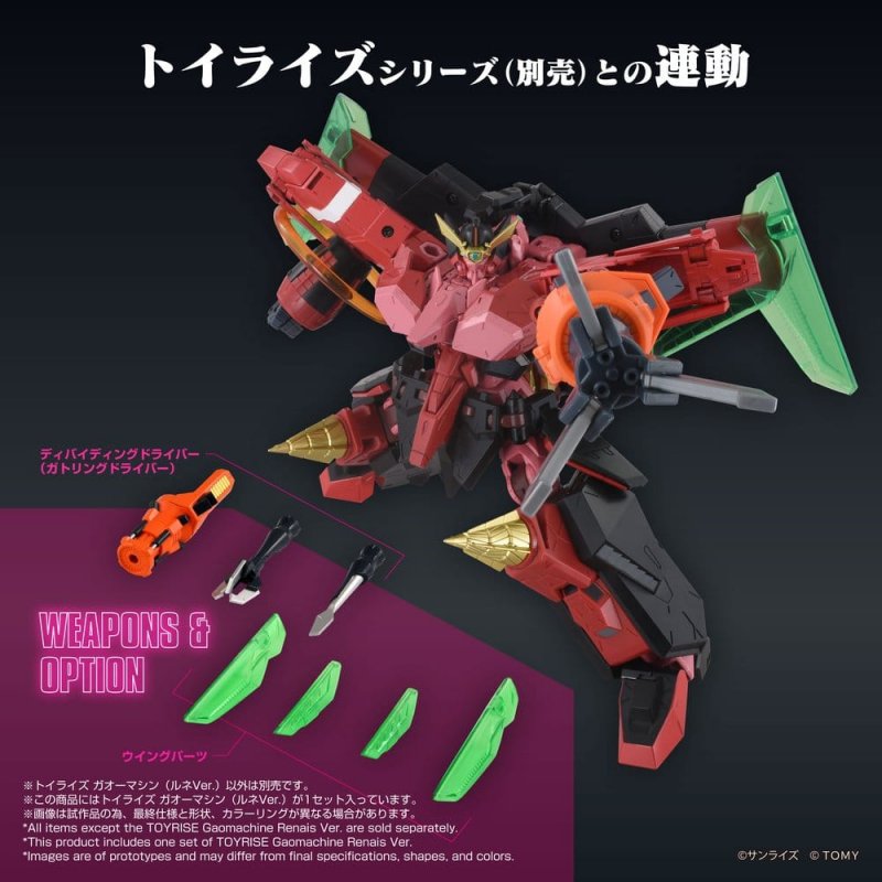 From “The King of Braves GaoGaiGar Final”, Gao Machines (RENAIS Ver.) join the Toyrise series! Gao Machines Liner Gao II - Drill Gao II - Stealth Gao III Recreate the full combined form with all Gao Machines that appeared in HAKAIOH, without any surplus parts. (Note: To form the combined mode, the separately sold “Toyrise GaoFar RENAIS Ver.” is required.) As a Toyrise -original gimmick, each Gao Machine can also be equipped as armaments. Equipped with 5mm joints throughout, allowing for user-original custom builds. Furthermore, by combining with separately sold “Toyrise Genesic GaoGaiGar,” “Toyrise GaoFighGar,” and “Toyrise GaoGaiGar,” even more customization is possible! Please note: Depending on the combination, the figure may not be able to stand on its own. To combine with “Toyrise GaoFighGar (RENAIS Ver.),” the separately sold “Toyrise GaoFar RENAIS Ver.” is required.