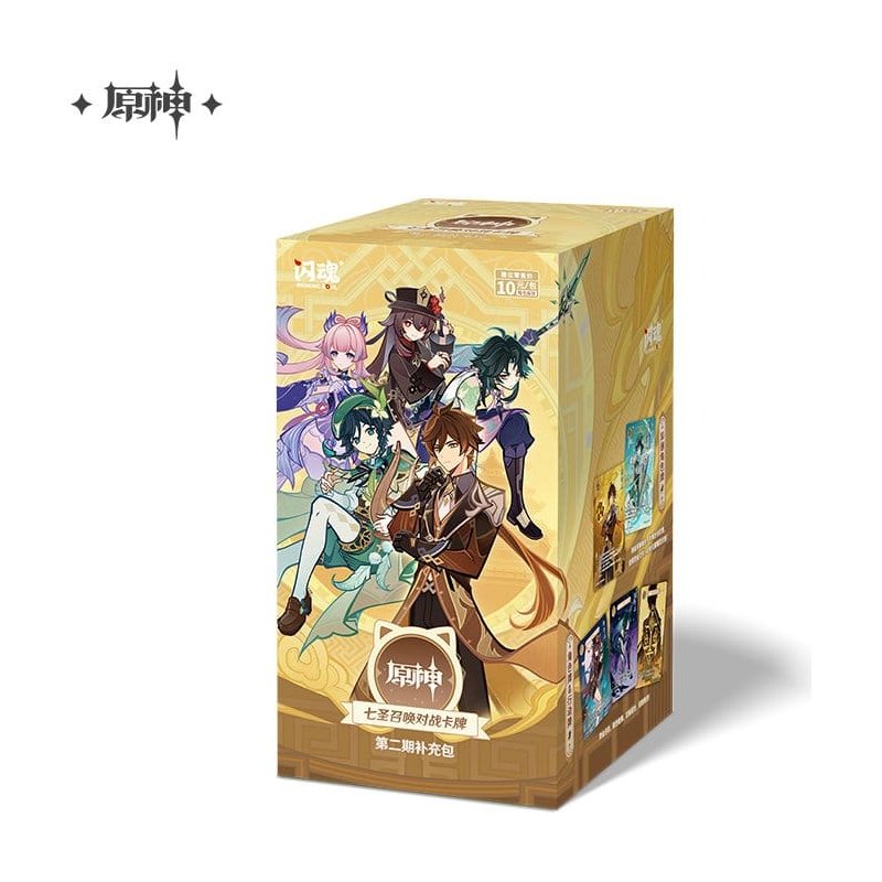 This is a display box for Series 2 of the Genshin Impact Trading Card Game by HoYoverse. This is the Chinese version of the product. Each display contains 18 booster packs, with each pack containing 6 cards.