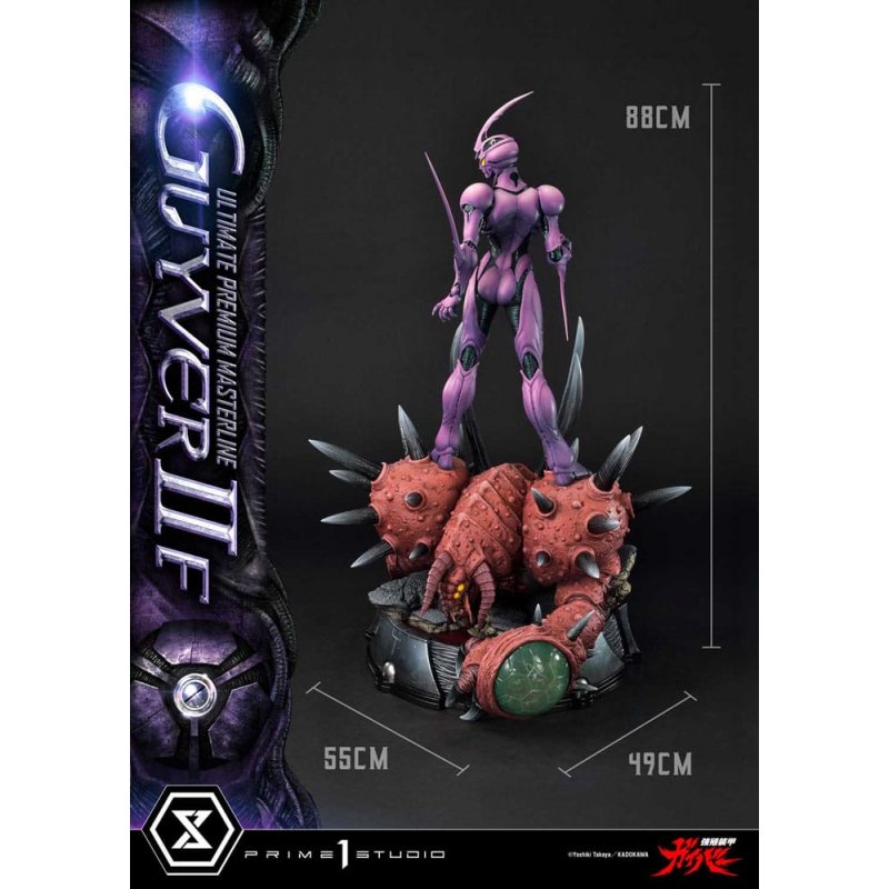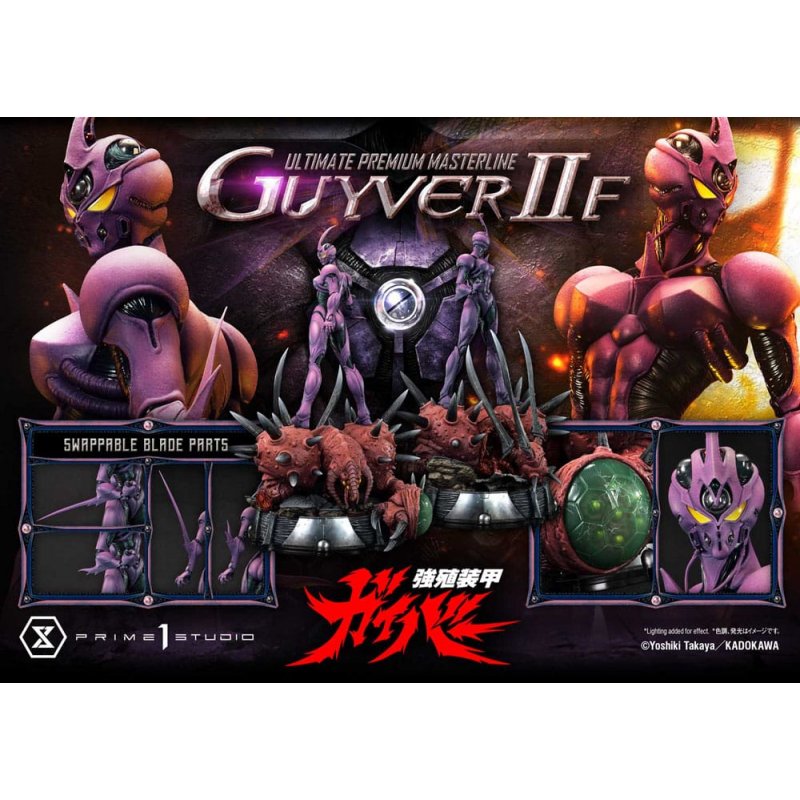 "A Solitary Will Dwells Within an Enigmatic Back.The Beautiful Bioboosted Warrior Emerges from an Iconic Cover Art.In 2025, the legendary sci-fi comic "Bio-Booster Armor Guyver" by Takaya Yoshiki will celebrate its 40th anniversary. From this iconic masterpiece comes the Ultimate Premium Masterline 1/4 scale figure of Guyver IIF (Female).Valkyria Forsberg Lisker is a woman who stops at nothing to achieve her goals and refuses to side with anyone. This figure captures her bioboosted form in stunning detail, inspired by the cover art of Volume 26. From the weighty metallic finish of the Control Medal to the vivid gradients and shading of the purple armor, and the intricately sculpted elegant body lines, every aspect brings to life the unforgettable image etched in fans' minds. The high-frequency blades on both arms come in two variations-long and short-allowing you to display them in your preferred style.At her feet lies the lifeless body of Zerbebuth-R, a fearsome Hyper Zoanoid who engaged in a fierce battle against her. The destroyed remains of this formidable enemy showcase the Guyver IIF's extraordinary combat prowess and ruthless determination. From the high-frequency claw on her right arm to the thermal cannon on her left, the intricate sculpting and detailed paintwork are truly stunning, creating an immersive display scene that rivals her own commanding presence.The enigmatic beauty of this bioboosted warrior, with a solitary will emanating from her mysterious back, is brought to life in exquisite detail befitting the 40th anniversary of "Guyver." A must-have for every fan, this figure is a true masterpiece.Specifications:- Bioboosted Armor Guyver Themed Base - 1 Swappable Head (Full Face) - 2 Right High-Frequency Swords (Long, Short) - 2 Left High-Frequency Swords (Long, Short)