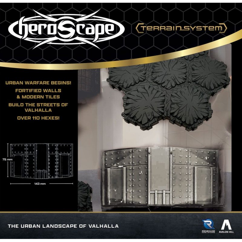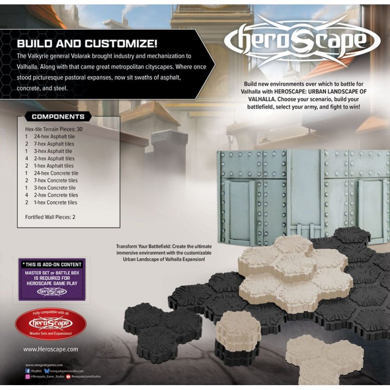Forge your battles in the heart of Valhalla's sprawling cityscapes! Once pastoral and pristine, these streets now bristle with asphalt, concrete, and towering steel-remnants of the Valkyrie General Volarak's push for mechanization. The Urban Landscape of Valhalla expansion lets you transform your battlefields into gritty urban warzones, perfect for ambushes, choke points, and high-stakes showdowns.With a versatile mix of asphalt and concrete hex tiles, plus fortified walls for defensive strongholds, this set expands your tactical options and immerses you in a whole new theater of combat.Fully compatible with all Heroscape Master Sets and Expansions.Contents- Hex-tile Terrain Pieces (30) - 1× 24-hex Asphalt tile - 2× 7-hex Asphalt tiles - 1× 3-hex Asphalt tiles - 4× 2-hex Asphalt tiles - 2× 1-hex Asphalt tiles - 1× 24-hex Concrete tile - 2× 7-hex Concrete tiles - 1× 3-hex Concrete tile - 4× 2-hex Concrete tiles - 2× 1-hex Concrete tiles - Fortified Wall Pieces (2)Features- Bring the fight to Valhalla's city streets with asphalt, concrete, and fortified walls. - Fortified Control Points - Use the included wall pieces to anchor defenses or force enemy breakthroughs. - Transform your battlefields into gritty urban warzones-fully compatible with all Heroscape Battle Boxes, Master Sets and ExpansionsAt a Glance- For Ages: 14+ - Game Type: Miniature Game Terrain Expansion, Add-on product.
