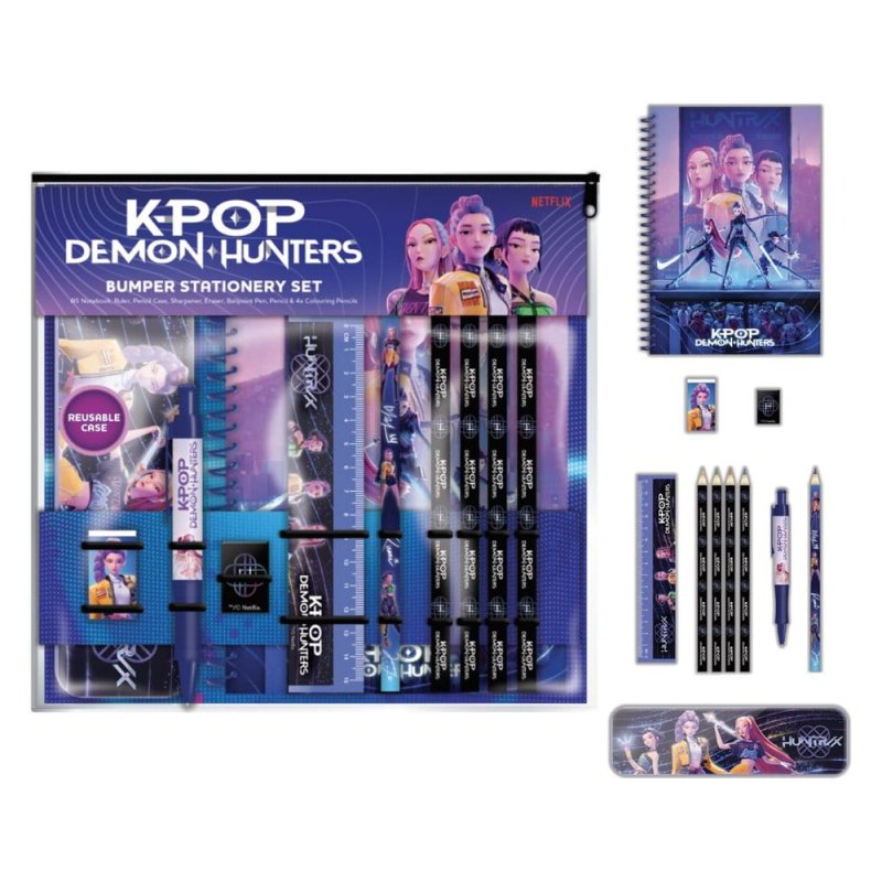 This cool KPop Demon Hunters stationery set inlcudes:1 x Pencil 1 x Sharpener 1 x Eraser 1 x Ruler 1 x Ball pen 1 x Pencil case 3 x Colored pencils 1 x A5 Notebook The set comes in a blister packaging.