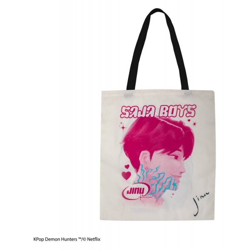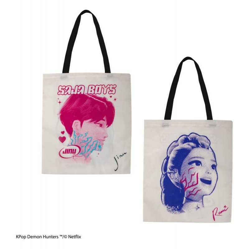 This is a tote bag from the KPop Demon Hunters license, featuring Rumi & Jinu. Made from 95% Polyester and 5% Cotton. Size: 42 x 38 x 0.5 cm (16.5" x 15.0" x 0.2")