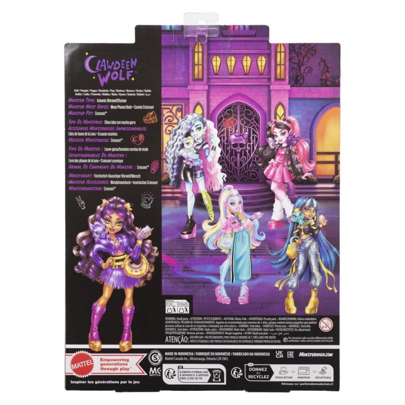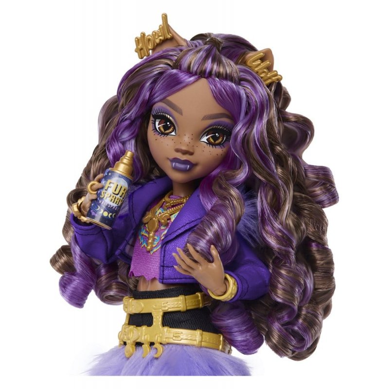 Beware of goosebumps: this Monster High doll's style is claw-tastic! Clawdeen Wolf is wildly fashionable in her furry purple outfit with seven accessories. She comes with her loyal wolf Crescent, who is ready for all kinds of full moon adventures! Children aged 4 and up will love haunting the rooms of Monster High with this posable Clawdeen Wolf doll. Fully posable. The doll cannot stand on its own. Colours and design may vary.