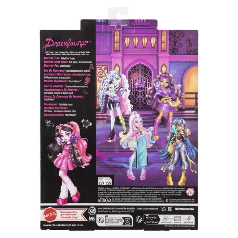 Beware of goosebumps: the style of this Monster High doll is simply vamptastic! The Draculaura doll looks absolutely adorable in her bow dress and comes with seven accessories. Her faithful companion is Count Fabulous, who is always ready for terrifying adventures with a bite! Children aged 4 and up will love haunting the rooms of Monster High with this posable Draculaura doll. Fully posable. The doll cannot stand on its own. Colours and designs may vary.