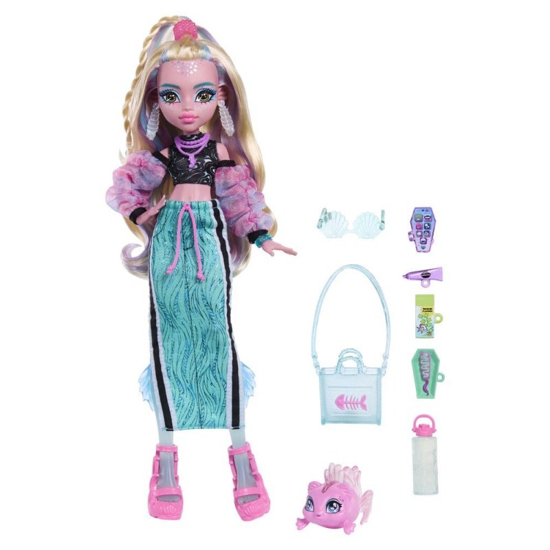 This sea-tastic doll from Monster High is spookily stylish! The Lagoona Blue doll brings deep-sea fashion to the surface with a bubbly chic outfit and seven accessories. She comes with her trusty fish Neptuna, who is ready for abysmal adventures! Children aged 4 and up will love haunting the rooms of Monster High with this posable Lagoona Blue doll. Fully posable. The doll cannot stand on its own. Colours and designs may vary.