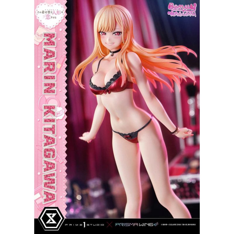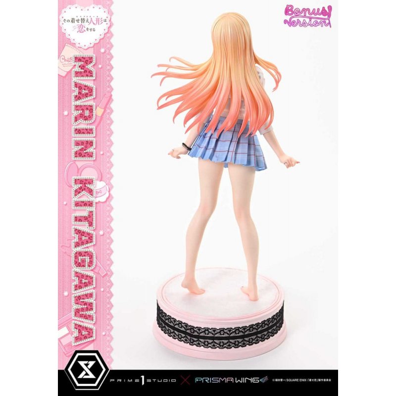 From TV animation My Dress-Up Darling, Marin Kitagawa brought to life in two different looks. Marin Kitagawa from TV animation My Dress-Up Darling joins the Premium Masterline series! This 1/4 scale statue captures every bit of her charm. Her natural pose, shown through her long and slender limbs, was carefully crafted with a focus on full-body balance and the subtle shift of her weight. Both the sculpting and coloring are finished with meticulous attention to detail. Her light, fluttering hair, the soft blush on her cheeks, and the delicate texture of her translucent skin-all the impressions from the anime are vividly brought to life. The accessories, such as her choker, bracelets, and the glossy finish on her nails, add a touch of elegance and refinement. The specially designed base, adorned with fur and lace, enhances the fresh, radiant feel of the piece. Her school uniform blouse, necktie, and skirt are made from real fabric. The materials and sizing were carefully selected to perfectly recreate her relaxed, effortless style. Beneath the uniform, she reveals an elegant lingerie look, smiling with a fashionable color scheme and a healthy, vibrant figure. Additionally, this Bonus Version includes an interchangeable left arm part, allowing for a different pose. With this part, she clasps her hands tightly together and gazes sweetly ahead-a special touch that will make you fall even more in love with her. Marin Kitagawa, beautifully realized in two different looks-don't miss the chance to add her to your collection! Product Specifications: - My Dress-Up Darling Themed Base - 1 x Swappable Left Arm (Peace Sign) - 1 x Swappable Left Arm (Closed Hand) [BONUS PART]