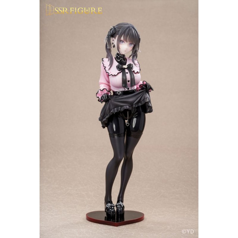 The "Dear My Rubber" Kurokawa Miu 1/6 Complete Figure is a stunning three-dimensional recreation based on an original illustration by artist YD. The figure captures the elegant moment as the girl gently lifts her skirt, with a pink top adorned by a black bow, showcasing the signature sweet yet mysterious charm of the deredere aesthetic. The contrast between the glossy finish of the latex-like outfit and the soft texture of her clothing highlights her slender waist and long legs, radiating an unique allure. As a finishing touch, the figure comes with a heart-shaped base printed with stylized theme text that perfectly complements the overall presentation. The bonus item is a lenticular tin badge designed based on the original illustration - it changes expression depending on the viewing angle, adding a fun and exclusive touch to the set.