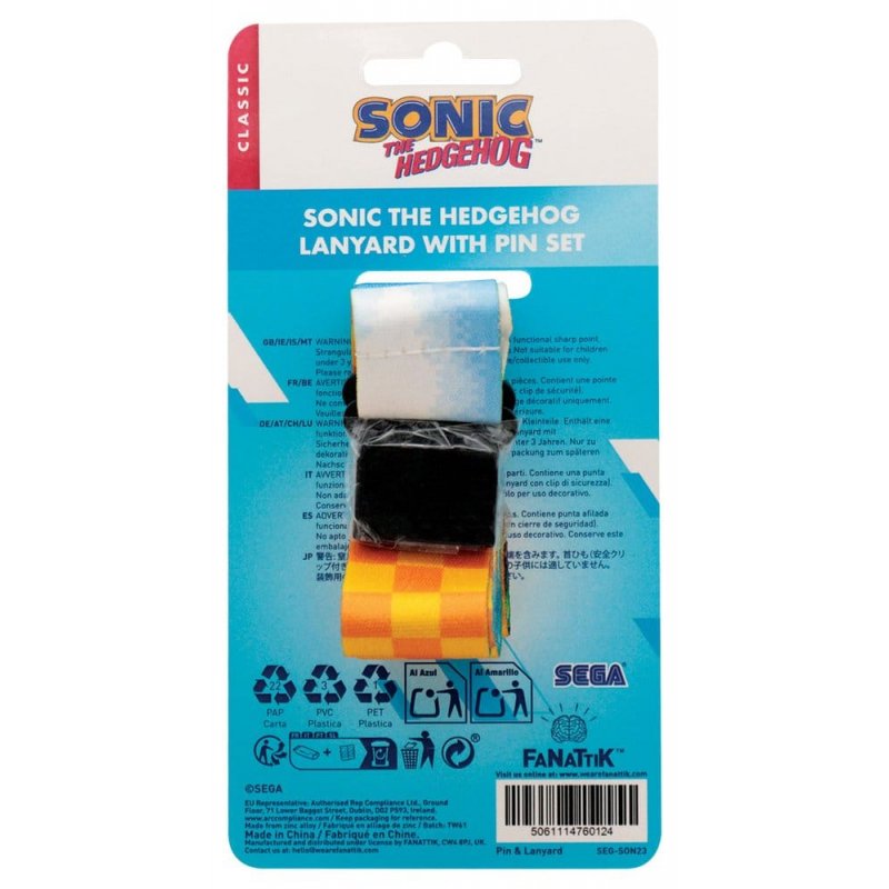 Knuckles and Tails in the Green Hill Zone with various rings are featured on this Sonic the Hedgehog lanyard, and with it comes a Sonic pin badge with the spiky-haired speedster giving the peace sign. The lanyard, featuring a plastic clip at one end with a metal clip at the other, measures 100cm in total and 3 cm in width. The pin badge measures 5 x 3 cm