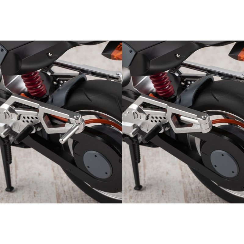 A highly versatile black color that can be used in any scene! A color variant of the Extreme Sports Bike joins the Kotobukiya exclusive lineup. A first for Kotobukiya’s original bike lineup, this is a standard, non-combat motorcycle. However, thanks to designer F, who also designs Megalomaria and M.S.G, it pairs exceptionally well with various series. At 1/10 scale, the total length is approximately 195mm. Sized to be ridden by character models with a total height of about 160mm, impactful scenes can be created by combining it with kits such as Maria Kagaribi [Dress Code] or Emulator from the Megalomaria series. Enjoy this snap-fit bike kit that is just as easy to assemble and enjoy as character model kits! *Rui Saotome?Touou High School Tracksuit?Dreaming Style Midnight Onyx requires the use of the riding body to board the bike. Features: The handlebars and tires are linked, allowing the steering angle to be changed. The tires can also freely rotate, allowing for manual rotation. The tandem steps at the rear of the vehicle can be deployed. In addition, a 3mm connection point is located at the bottom of the vehicle’s body, allowing it to be displayed using the separately sold Flying Base. Full-Face Helmet: By pulling out the top part of the helmet and the internal base, separately sold Sousai Shoujo Teien face parts can be used. This allows the expression to be changed to various compatible characters, such as Rui Saotome. The visor can be opened and closed. It is molded in clear plastic so that the attached face part can be easily seen. The interior of the helmet was meticulously sculpted to match the bangs and nape of Rui. It is compatible with Megalomaria (female body type) face parts, allowing for various combinations. The skin tone at the neck uses Skin Color C, allowing the face parts of a wide range of characters to be attached. *Regarding helmet compatibility: Sousai Shojo Teien's Ao Gennai and Bukiko Kotobuki use unique standards so they are not compatible with the helmet. *The helmet is the same as that included with Rui Saotome?Touou High School Tracksuit?Dreaming Style Midnight Onyx. Gloves: Three types of gloved hand parts are included: Open, Closed, and Gripping Handlebars. These hand parts can be attached kits from the Sousai Shoujo Teien series and Megalomaria series. Coloring: Bike: Black 1, Black 2, Gray, Smoke Gray, Clear Turquoise Green, Clear Orange, Clear Red, Orange, Red, Silver Full-Face Helmet: Black, Clear Black, Skin Color C, Milk Tea (Hair Color) Gloves: GrayIncluded Items: - 1 x Extreme Sports Bike - 3 x Glove Parts Types Left/Right (Open, Closed, Gripping Handlebars) - 1 x Full-Face Helmet.
