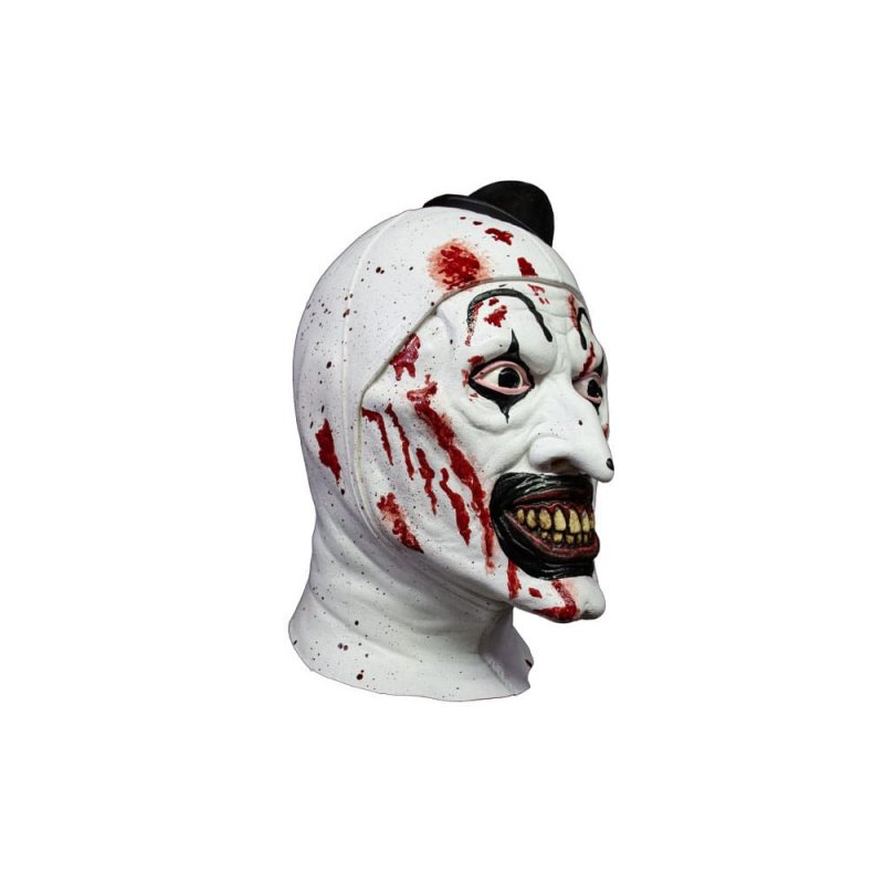Designed by Russ Lukich. Trick or Treat Studios and Dark Age LLC are proud to present the Official Terrifier Killer Art the Clown Mask! This amazing mask is a perfect version of the makeup worn by Art the Clown in the Cult Classic, Terrifer. Every detail of Art the Clown is included in the mask including his crazy eyes, pointy nose, maniacal grin and bloody face. So order the your Official Terrifier Art the Clown Mask today and Terrify the neighborhood this Halloween!