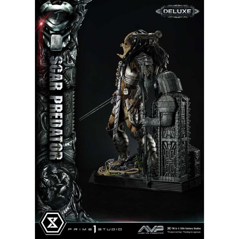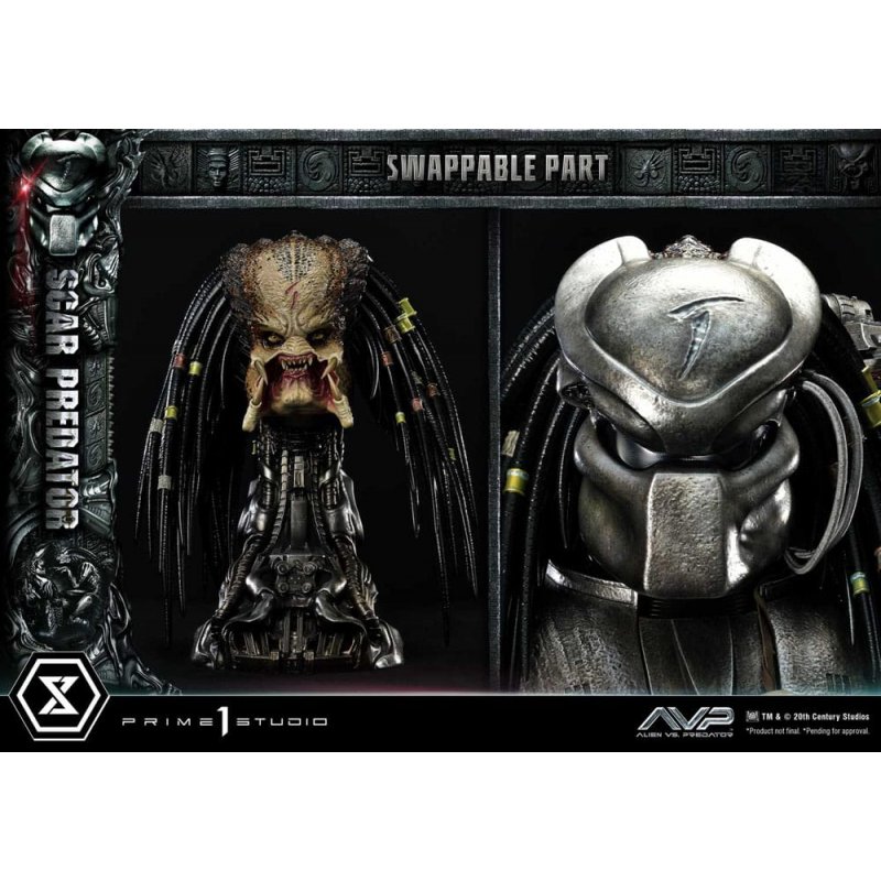 "The enemy of my enemy is my friend..." - Alexa Woods, to ScarIt has been almost twenty years since Alien vs. Predator, also known as AVP, was released and blessed both Aliens and Predators franchise fans, pitting the creatures against each other in an action-packed, sci-fi horror film. Prime 1 Studio is excited to present our next entry to the Predators grand family, joining the Museum Masterline Series, the 1/3 Scale MMPR-04DX Scar Predator Deluxe Version from the 2004 film Alien vs. Predator!In this incredible crossover blockbuster, Scar and his brothers Celtic and Chopper were all sent to Earth to undertake an initiation Hunt in an ancient pyramid buried beneath Antarctica. The pyramid served as a hunting ground, where Predators used Aliens as prey in order to graduate from Young Blood Yautjas to Blooded Yautja, thus being considered an adult and a full member of its Clan. Let us look closer at Scar, the youngest of the three Predator brothers.Once again, the incredible artisans at Prime 1 Studio brought their A-game to bring this imposing and fearsome extraterrestrial hunter to life. At a whopping 36 inches tall, Scar is fully armored and equipped with an arsenal of advanced technology and brutal instruments of death. As usual, the immense dedication and attention to detail from our artisans and sculptors that went into crafting this remarkable Predator statue ensures the utmost level of accuracy. From each single strand of dreadlock to the tiny Xenomorph skulls and the shading of the skin and armor. You will definitely see and feel our commitment to perfection with this piece! The iconic Bio-Mask features a distinctive mark on the forehead, referring to his name "Scar". The Plasmacaster is ready to unleash its devastating energy blasts on any prey that's unlucky enough to be targeted by the helmet's targeting lasers, both of which are LED illuminated a bright blue and red, respectively. He holds in his right hand the Combistick, a spear-like weapon that serves to impale victims from a distance. In contrast, the gauntlet-integrated Wristblade, in its retracted state, is designed for close-quarters combat, allowing him to slice through flesh and bone with brutal efficiency. His left hand is equipped with a massive Shuriken, absolutely lethal when thrown. The Wrist Gauntlet is also equipped with LED illuminating functions. The base features ancient Yautja-constructed ruins as well as the corpse of a Facehugger that has been freshly slain. We have also included a second head, without the Bio-Mask to display Scar's true face, and a head base for display. A silver "AVP" logo plate is also included for display at the statue's base.The Deluxe Version will allow you to mix and match a series of additional hand parts to find the perfect display to your liking. Two additional right-hand parts are included, one closed fist and one open palm. Two additional Wristblade lengths for the right gauntlet allow you to either fully or partially extend the deadly blades. The left hand comes with two additional open palm variations and an additional third head part featuring Scar's visage as he roars. A second headstand and logo plates are included for you to display.Pre-order this massive and fearsome 1/3 Scale MMPR-04DX Scar Predator Deluxe Version now and expand your collection while quantities last! And stay on the lookout for his two brothers, Celtic and Chopper in the very near future.Product Specifications:- Statue Size approximately 36 inches tall [H:93cm W:85cm D:91cm] - Statue Size approximately 36 inches tall [H:93cm W:85cm D:76cm] (Extended Wristblade) - Yautja-constructed pyramid themed-base - Three (3) Swappable head parts (Bio-Mask, Unmasked Classic Portrait, Unmasked Roaring Portrait) - Three (3) Swappable right-hand parts (Combistick, clenched fist, open palm) - Three (3) Swappable left-hand parts (Shuriken, clawing palm, open palm) - Three (3) Wristblades (Retracted, Partially Extended and Fully Extended) - Two (2) Movable Headstand - Two (2) Title Plaques - LED illumination on Helmet-mounted Targeting Laser, Wrist Control Panel & Shoulder-mounted PlasmacasterPlease note: Due to the size of this item, additional shipping costs may apply. Apart from your location, the actual package size and weight is needed to determine those costs. Both are unknown at this point and may not be available until the product arrives in our warehouse.