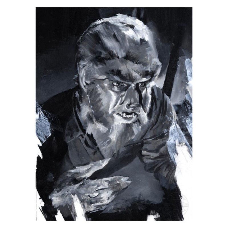 "It isn't a wolf ... it's a werewolf!"Sideshow Art Prints presents The Wolf Man Fine Art Print, an officially licensed Universal Monsters collectible by artist Chris Valentine.Beneath the fur and fangs, actor Lon Chaney Jr. treads the line between humanity and animality as the title character in the 1941 Universal Pictures film The Wolf Man. This monochromatic portrait of a man transformed captures the lycanthropic curse on Larry Talbot, burdening him with all the harsh qualities of a beast. Valentine's brush strokes and layering of light and shadow spotlight the character in a way that recalls the tradition of black and white filmmaking.Each The Wolf Man Fine Art Print features an embossed Sideshow Seal of Authenticity and is faithfully reproduced from the artist's original oil painting that was displayed and sold during the Sideshow x CODA Universal Monsters gallery exhibition. Available unframed or in a custom framed presentation, this horror movie artwork makes a stunning addition to any fan's art collection.Pair this print with Chris Valentine's other Universal Monsters Portraits -Frankenstein, The Bride of Frankenstein, and Dracula, each sold separately - for the ultimate collection of silver screen icons in your home.Say your prayers and bring home The Wolf Man Fine Art Print by Chris Valentine today.Print details: - Officially licensed by Frankenstein - 41 x 31 cm fine art giclée print - 100% cotton, acid-free, matte Museo - Rag 260GSM - Epson archival inks - Automated artist signature - Embossed seal of authenticity