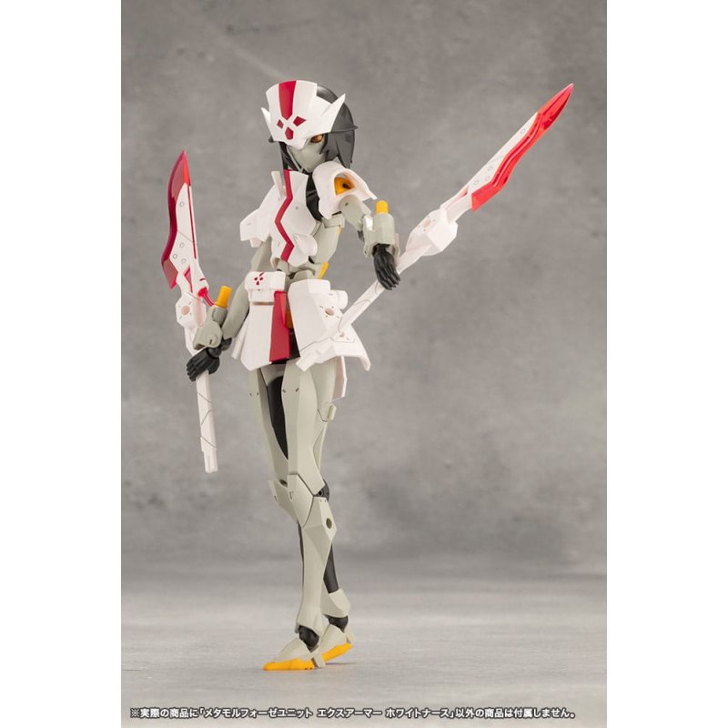 "Expand customization options for kits from the Megalomaria series with METAMORPHOSE UNITS! This optional set of items features an expansion armor based on the concept of the nurse outfit and weapon units based on medical tools. *The optional items have the same specifications of the items included with Ruby Eye. Scalpel: Includes two scalpel-like swords that are able to be connected to create a double-bladed sword. Injector: Includes syringe-like weapons that are able to be connected to the hardpoints of the marionnette style forearms. Unfolding the grips allow them to be used as handheld weapons. EXARMOR WHITE NURSE: The expansion armor skirt features a 3mm joint on each part and consists of six points of articulation. The Lifeblood Tank, equipped to the back of the model, is based on a blood transfusion pack and has been beautifully molded with clear colorless and clear red plastic. Lifeblood Capsules: The four Lifeblood Capsules are molded in clear red and clear colorless plastic and can be attached to models. Two Types of Masks: Includes the two masks that came with Ruby Eye; one with an eyepatch and one with both eyes open. The masks can be used with Principal (sold separately) and Sousai Shojo Teien models (sold separately). *Regarding visor/mask compatibility: Sousai Shojo Teien's Ao Gennai and Bukiko Kotobuki use unique standards so they are not compatible with Ruby Eye. Included Items: - White Nurse Exarmor Set x1 - Mask (Eyepatch) x1 - Mask (Both Eyes Open) x1 - Scalpel x2 - Double-Bladed Mode Connection Part x1 - Injector x2 - Lifeblood Capsule x4 About TOKYO Mark TOKYO Mark is a label for products that incorporate manufacturing technology from Japan. By creating a partnership with factories specialized in various technologies based in several locations, we strive to concentrate in and deliver from Tokyo-where Kotobukiya is based-and provide high quality products through this label."