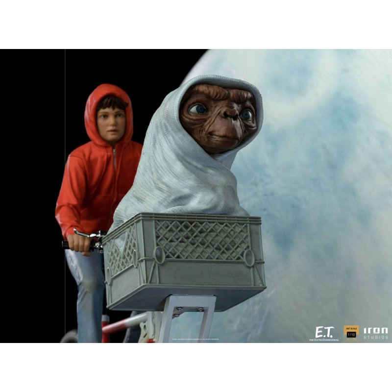 A boy carries in his bicycle basket, wrapped in a white sheet, an unusual friend, a small alien lost on Earth that is being pursued by government forces. In their flight to find their fellow men and return to his world, the two friends run towards a California forest, where the spacecraft that will rescue him must land. To escape a police blockade, the little alien uses its telekinetic abilities to levitate the bike, lifting them into the air and flying over the trees towards their destination. This anthological scene, which has the moon as a backdrop, was also used in the promotion of the film, becoming one of the best known and most striking images in cinema, even becoming the logo of Amblin Entertainment, Steven Spielberg's film producer, and now also proudly replicated with the statue "ET & Elliot - Art Scale 1/10 Deluxe - ET - Iron Studios" and "E.T. & Elliot - Art Scale 1/10 - E.T. - Iron Studios".Created by Steven Spielberg and written by Melissa Mathison, 1982's ET the Extra-Terrestrial is among the highest-grossing films of all time, winning four Oscars, and added to the Library of Congress's National Film Registry, being designated as culturally, historically, or aesthetically significant.In the film, a group of botanical aliens secretly visit Earth at night to collect plant specimens. With the arrival of US government vehicles, the group leaves Earth in its spaceship, leaving one of its small members behind, who had separated from the group. The creature ends up meeting a local boy named Elliott, who then goes on to hide and protect the little lost being on Earth, creating a tender bond of friendship with a deep empathic connection between them.Features:- License: License: E.T. - Scale: 1/10 - Limited Edition - Based on original references - Made in polystone - *(may contain parts in resin, polystone, PVC, metal and fabric) - Hand Painted - Light-up LED - Product dimensions: 27 x 23 x 19 cm