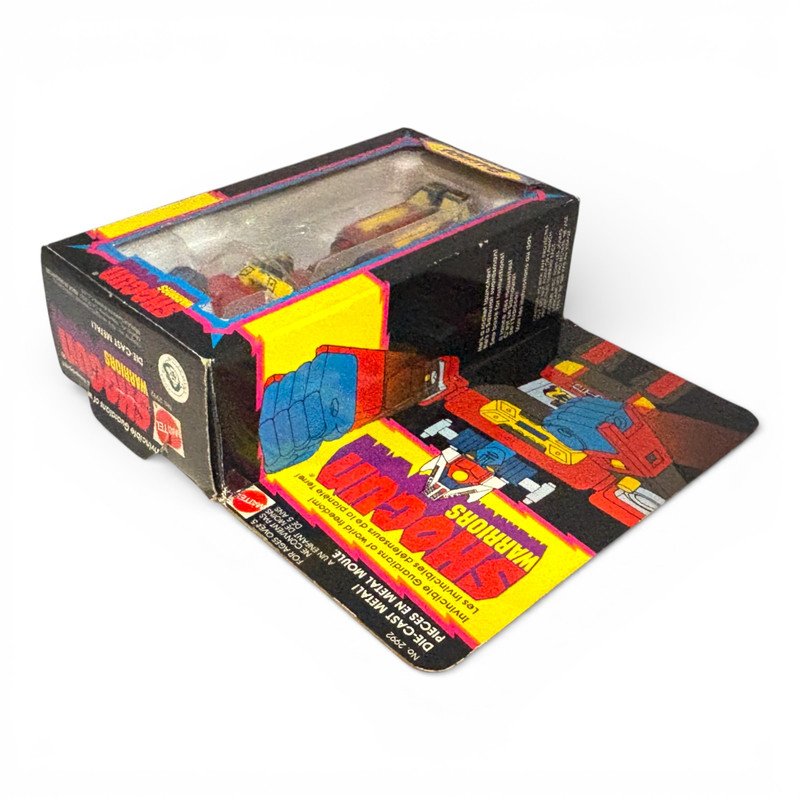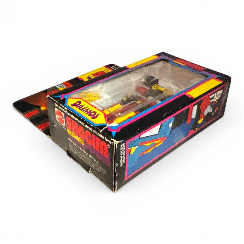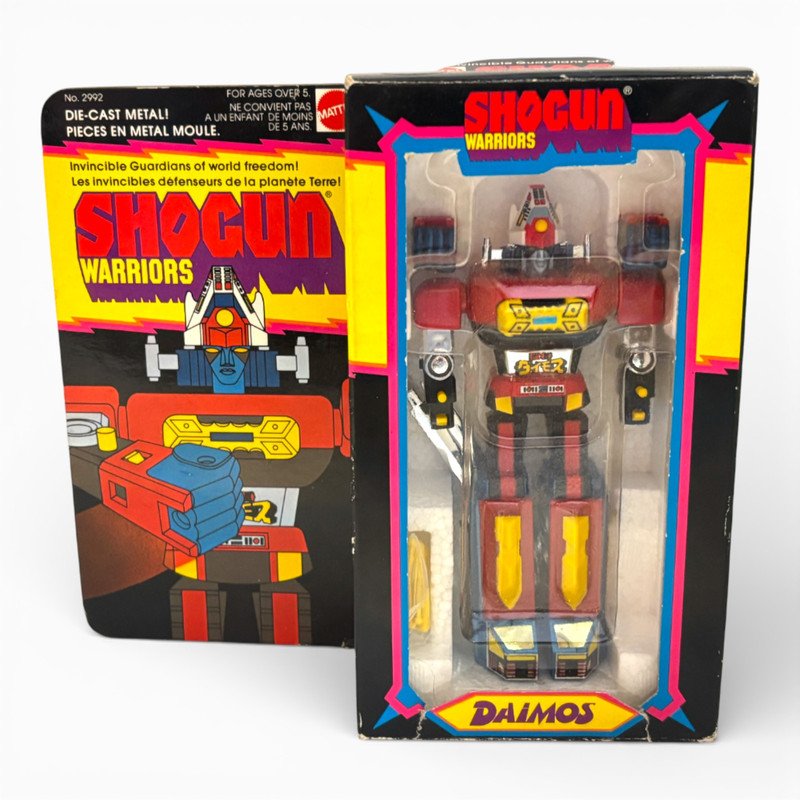 Shogun Warriors Daimos (No. 2992) — Rare International edition featuring the bilingual English/French window box. Produced by Bandai Singapore in 1979 for the late-series European rollout. This piece is preserved in unplayed condition and remains 100% factory complete. Notably, all accessories (Sword, Fists, and Yellow Missiles) remain factory-sealed in their original plastic baggie. Complete with original styrofoam insert and clear plastic tray.