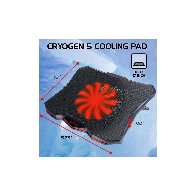 ENHANCE Cryogen 5 Laptop Cooling Stand with Green LED. Cryogen is the ideal thermal management system for gaming laptops.- Two USB ports provides extra prot for USB data pass-through - Adjustable dial speed control - Adjustable legs provide 7 height settings - Large cooling surface fits up to 17.3 inch laptops - LED lighting on fans deliver stunning illumination