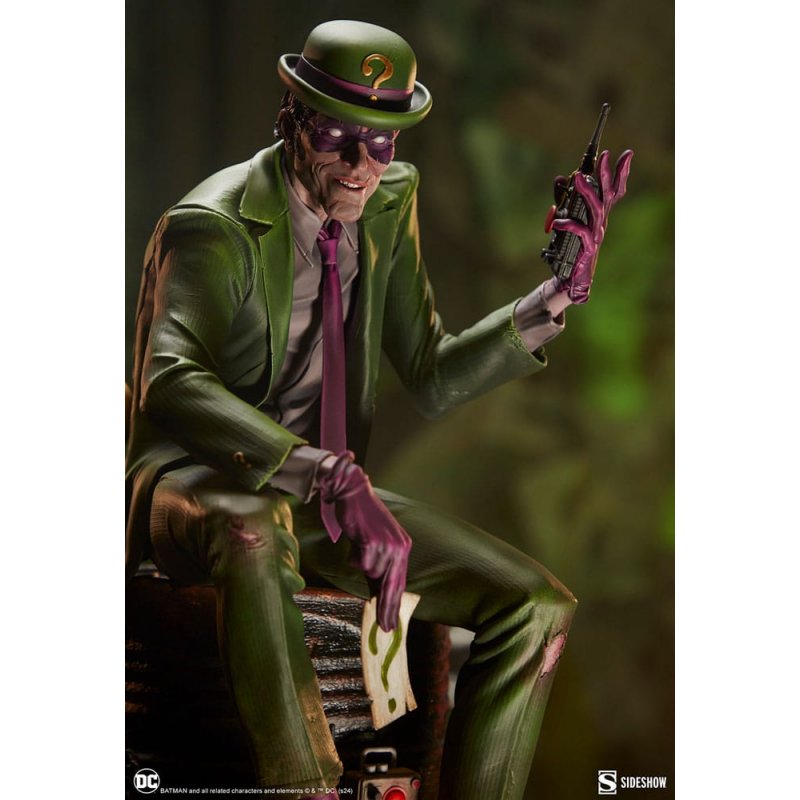 "What number comes after three, when the Knight fails? The answer is two ... one..."Sideshow presents The Riddler™ Premium Format™ Figure. This sinister DC collectible invites you to solve a high-stakes mystery deep in Gotham's underbelly.The Riddler Premium Format Figure measures 19.5" tall, 11.8" wide, and 14.3" deep as an egotistical Edward Nygma taunts Batman from atop a lacquered black barrel. Sinewy and sociopathic, the master strategist holds a good old fashioned paper riddle in one hand and a detonator in the other. The Riddler has purposefully put himself front and center in this rusted warehouse. Clues and threats - including Wayne Tower security footage and blueprints, an electronic keypad, a question mark cane, generators, gasoline drums, chains, and wires - are piled high. Now Riddler's got Batman right where he can see him put together all the puzzle pieces ... or die trying.Inspired by the character's comic book appearance, The Riddler Premium Format Figure presents this Gotham City villain at his most cunning and condescending. He wears his classic green suit and bowler hat, a purplish gray undershirt, and a purple tie and mask with matching dress socks and gloves. The DC statue's industrial base is rife with risks aimed to test the so-called World's Greatest Detective. If The Riddler wins, Wayne Tower goes BOOM! So, tick, tock. Time's almost up.Riddle us this: What do you get when you order The Riddler Premium Format Figure by Sideshow? There's only one way to find out!49 x 30 x 36 cm 19.5" H x 11.8" W x 14.3" L