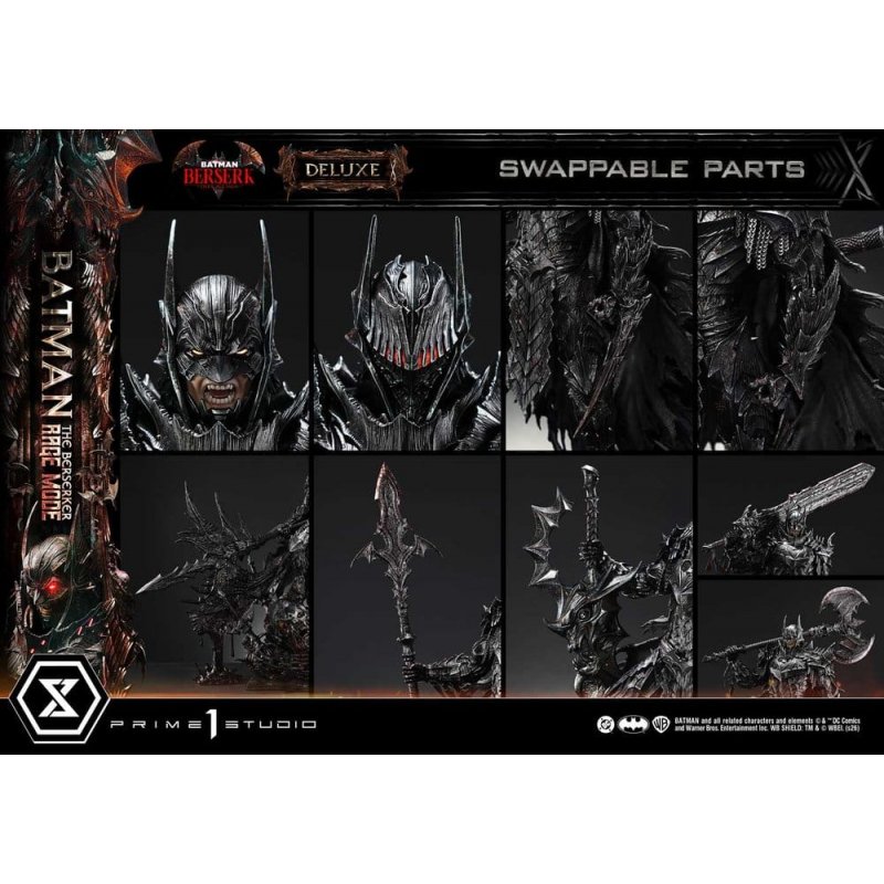 A colossal axe strike brings judgment upon a world without justice. The enraged Dark Knight is given form in 1/4 scale.A new hero emerges within the DC Omniverse-Batman: The Berserker Rage Mode joins the Ultimate Premium Masterline lineup.Venturing alone through a world crawling with demons, Batman wields the power of darkness to strike down darkness itself. This statue gives form, at 1/4 scale, to the dark hero envisioned by Prime 1 Studio. Standing with the massive axe "Judgment of Faith"-a fusion of four weapons-in hand, the piece pursues a powerful silhouette and densely layered detail.The full-face head represents the Final Form of a helmet that transforms in response to surging emotion. Red LED illumination in the eyes expresses a rage on the verge of consuming reason itself. The armor, which binds the body like restraints, was crafted under the theme of dark protection, emphasizing a sinister presence. From the widely spreading cape, bats take flight, heightening the drama of the moment.At his feet lies Bane, transformed into a demonic creature and impaled by a sword. His unfocused eyes, rigid fingers, and the heavy presence of helmet and chains are rendered with meticulous attention to texture and color, capturing the realism of a final, dying scream.Deathbringer Sword, Spear of Justice, Phantom Axe, and Demon Slayer. All four weapons are also included in their pre-fusion forms. Combined with the First Form head, which reveals the mouth, and a left arm equipped with an extended wrist blade, you can create a variety of dramatic scenes.Presented by Prime 1 Studio, the enraged Dark Knight. Within your collection room, the curtain rises on a story arc that no one has yet witnessed. Product Specifications: - Batman: The Berserker-Themed Base - 2 x Swappable Heads (Final Form; First Form) - 5 x Swappable Right Arms (Judgment of Faith, Deathbringer Sword, Spear of Justice, Phantom Axe, Demon Slayer) - 2 x Swappable Left Arms (Bare Hand, Wrist Blade) - 1 x Head Stand - LED Illumination (Batman's Eyes)LED Power Supply Method: TBD * Please prepare batteries, USB cables, or other necessary items depending on the final power supply method. "