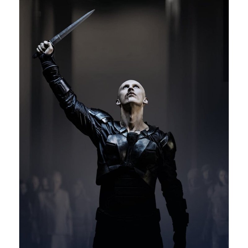 United Cutlery's Emperor's Blade replica is an exact reproduction of the actual filming prop used in the Dune films. The 15 1/4" stainless steel blade (false edged) is engraved in imperial symbols. The cast metal handle is black coated with intricate raised silver decorations, precisely matching the filming prop. This stunning reproduction is displayed on a wood wall display adorned by the sigil of House Harkonnen. A certificate of authenticity is also included with the Emperor's Blade to assure customers of its value and officially licensed status.Details: - Blade length: 38.74 cm - Blade material: steel - Handle material: cast metal