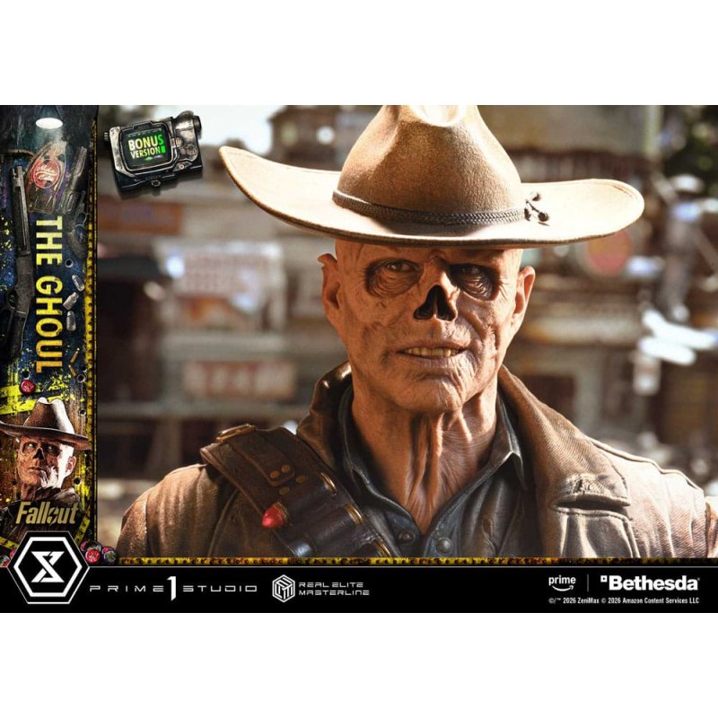"Well, maybe not, but I'm gonna make myself welcome." A rogue bounty hunter, brought to life with the Wasteland's reality.Fallout is a post-apocalyptic ensemble drama where brutal violence and black humor swirl together. From the live-action adaptation of the long-running RPG comes one of its central figures, The Ghoul-now joining the Real Elite Masterline lineup.His presence, feared by all across the Wasteland, is captured with exquisite precision in 1/4 scale. The pose, aiming The Ghoul's Revolver from the hip, evokes the unforgettable shootout in Filly. From the arch of the torso to the fanning left hand, every detail has been refined to create a taut, suspense-filled balance.An exposed nasal cavity, parched skin, and a cold, ruthless glint in the eyes. Into this feral-worn portrait, we poured state-of-the-art sculpting and paintwork. From the frayed long coat to the glossy holster, his Western style is rendered with meticulous texture and aging. And with swappable parts, you can also arm him with The Ghoul's Lever-Action Rifle.The specially designed base is composed to reflect his outlaw way of life. Dogmeat standing close at his side. A weathered Nuka-Cola refrigerator. A television with an LED-lit screen showing pre-war star Cooper Howard. Each element draws a story into your display.A rich set of additional parts further expands play value. Scanning the surroundings while taking aim. Reaching for the next round. Unleashing a storm of gunfire with black and silver single-action revolvers. Bring a wide range of gunfighting moments to life.And the head with a nihilistic grin is an exclusive bonus for the DX Bonus Version. It looks ready to drop an unforgettable punchline. Together with Lucy and Maximus, who will join the lineup in the future, this is a must-welcome addition to your collection. "Specifications:- Fallout-Themed Base - 2 x Swappable Heads (Right-Facing, Left-Facing) - 3 x Swappable Right Arms (Shooting from the Hip, Horizontal, Raised) - 3 x Swappable Right Hands for Shooting from the Hip (The Ghoul's Revolver, The Ghoul's Lever-Action Rifle, Single-Action Revolver [Black]) - 1 x Swappable Right Hand for Horizontal (The Ghoul's Revolver) - 2 x Swappable Right Hands for Raised (The Ghoul's Revolver, The Ghoul's Lever-Action Rifle) - 3 x Swappable Left Arms (Fanning, Shooting from the Hip, Lowered) - 2 x Swappable Left Hands for Shooting from the Hip (Single-Action Revolver [Silver], Cartridge) - 1 x Head Stand - LED Illumination (Television) - 1 x Swappable Head (Smiling) [BONUS PART] - 1 x Head Stand [BONUS PART]LED Power Supply Method: TBD * Please prepare batteries, USB cables, or other necessary items depending on the final power supply method.- Limited to 400 pieces