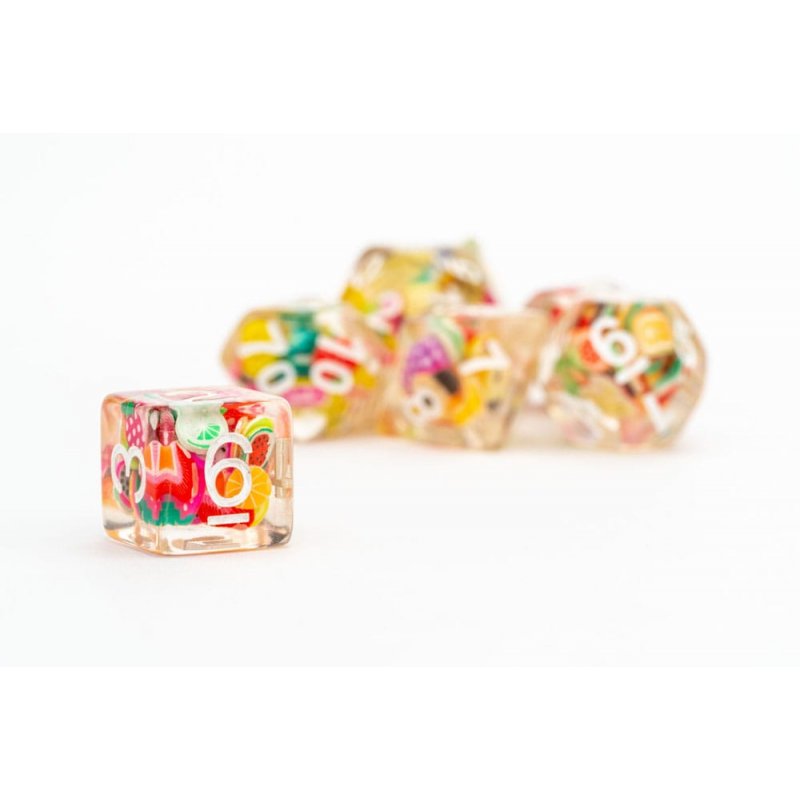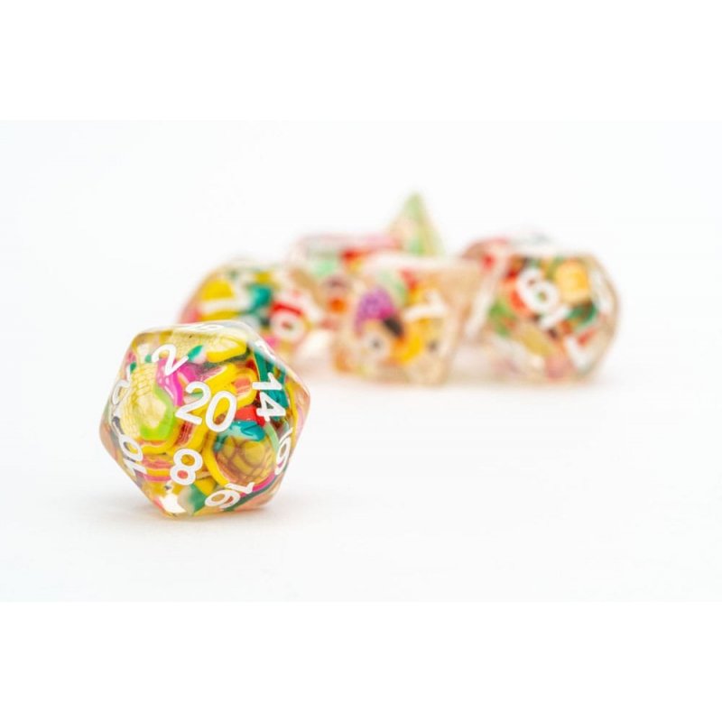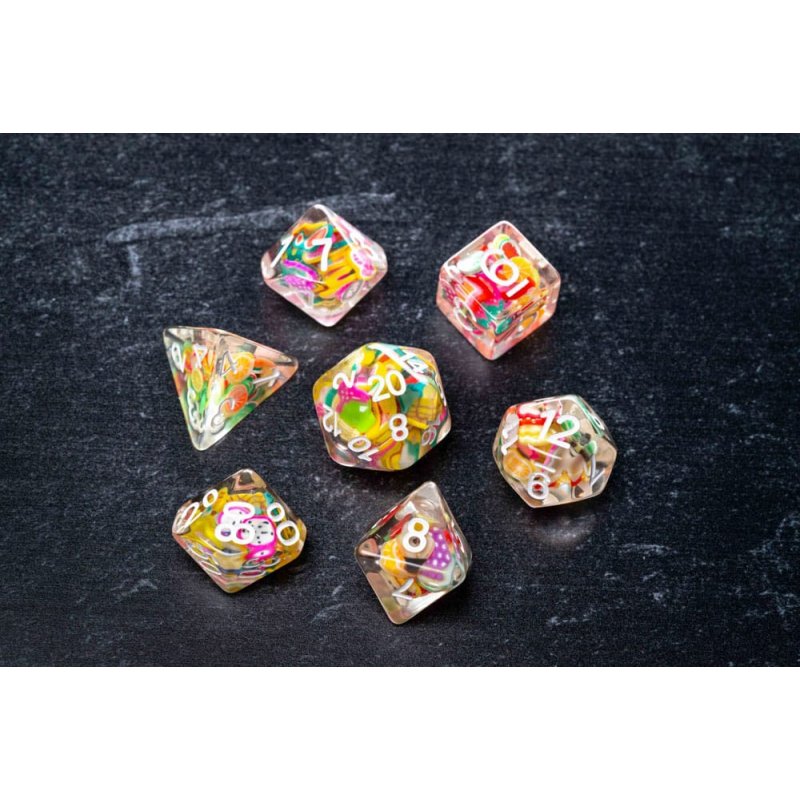 FanRoll resin dice have unique inclusions that add flare to any gaming table. These are full-sized 16mm polyhedral dice sets that come with 7 dice (d4, d6, d8, d10, d10%(00-90), d12, and d20).Contains: 7 dice