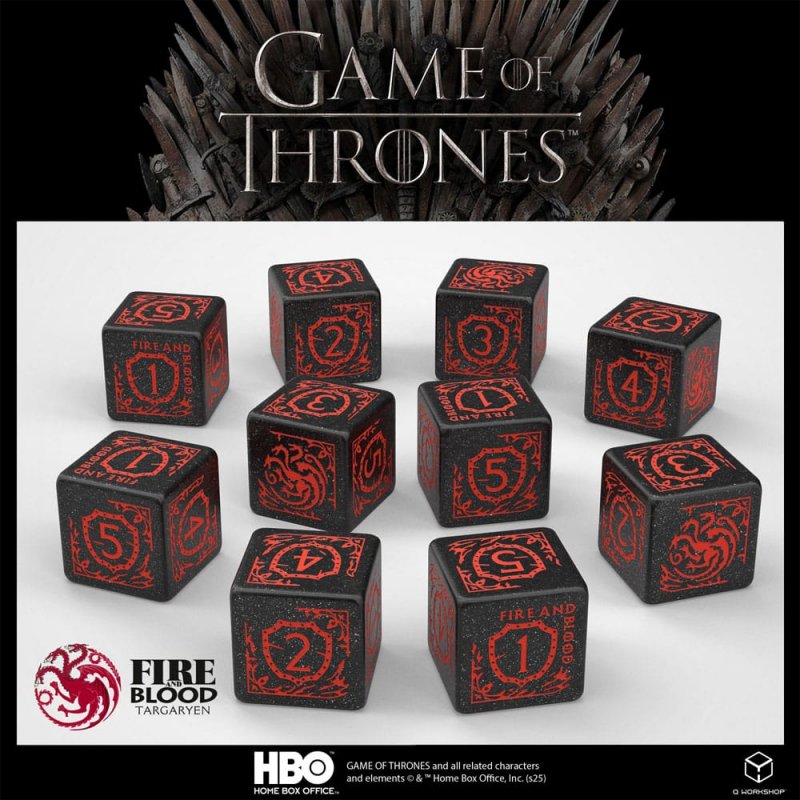 This officially licensed dice set channels the power of House Targaryen, with shimmering black dice and deep red engravings reflecting the house's fiery legacy. The trifold dragon sigil crowns each highest face, while the motto, "Fire and Blood," marks the lowest. A striking addition for those who embrace ambition, power, and the relentless force of destiny. A Prop of Dice and Flair - This set contains 10 pieces of six-sided dice (D6) of the same design.The Colors of Westeros - The shimmering black material of the dice (infused with glitter dust) is adorned with red paintings, ensuring high readability and immersion.House Targaryen - The highest value faces of each dice feature the three-headed dragon as the Targaryen sigil, while the lowest face is adorned with its motto, "Fire and Blood."Versatile Asset - This premium quality dice set is ideal for wargames, board games, RPG sessions, and as a treasured collectible of Game of Thrones fans.