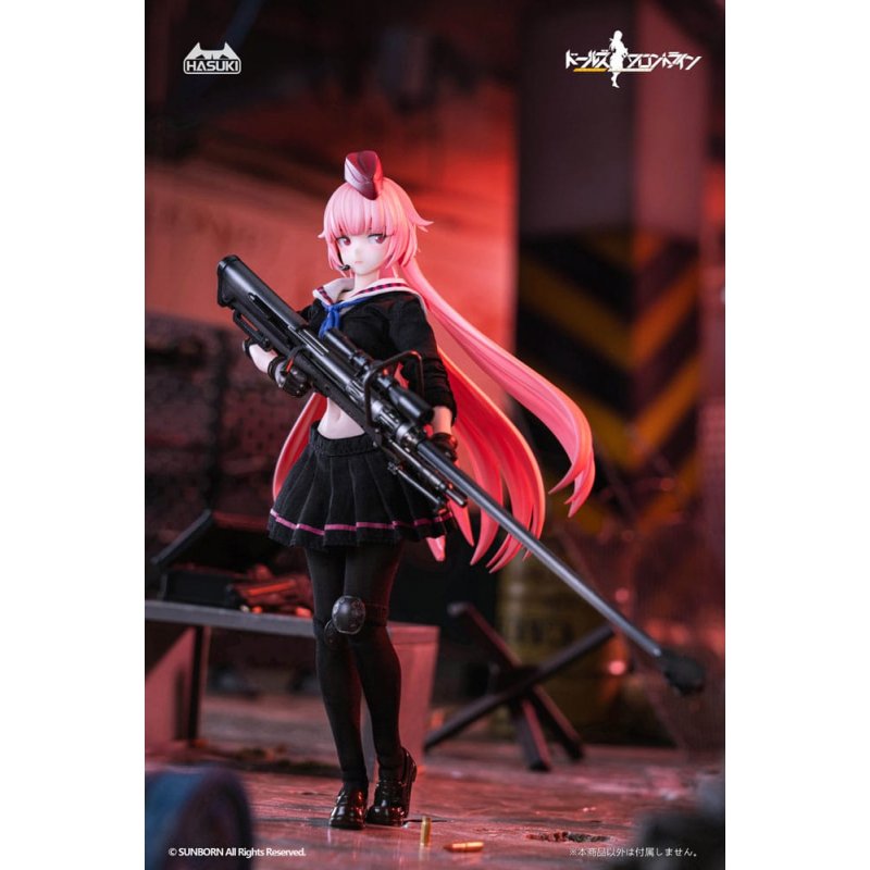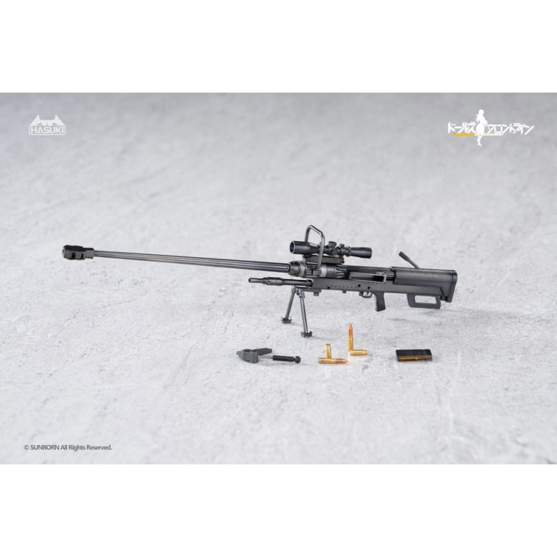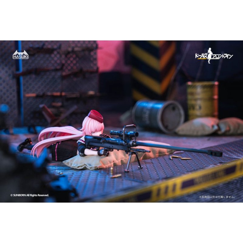 To the "Pocket Art" line comes this detailed action figure. It is about 15 cm tall and comes with interchangeable parts in a window box.Materials: ABS, PVC, FabricAccessoires:- 1 x Main figure - 1 x Cloth outfit set - 3 x Alternative face part (Expressionless, aiming, blushing, Default included. w/Adjustable eyes.) - 6 x Alternative hand parts (Default included) - 1 x Alternative front hair part - 1 x NTW-20 sniper rifle - 1 x Alternative bipod (Open) - 2 x Bullet - 2 x Cartridge case - 1 x Stand base set