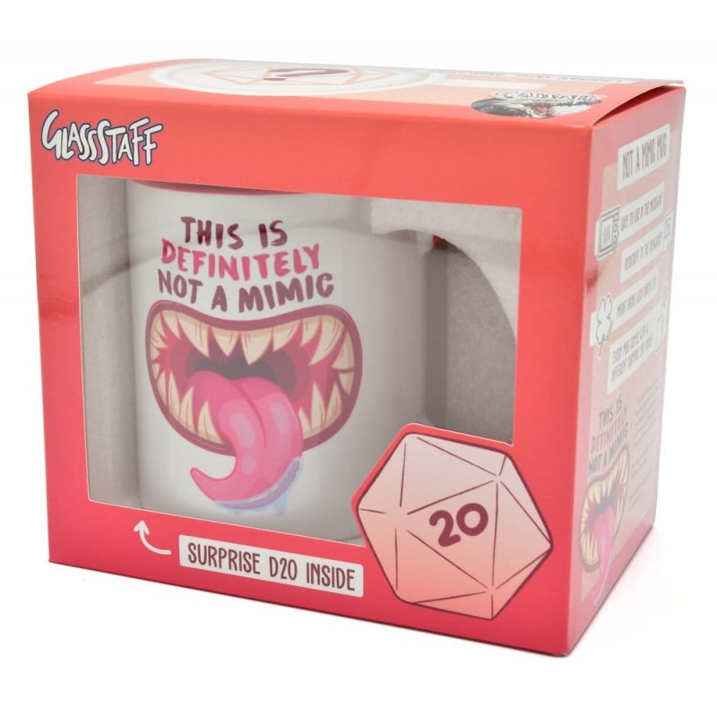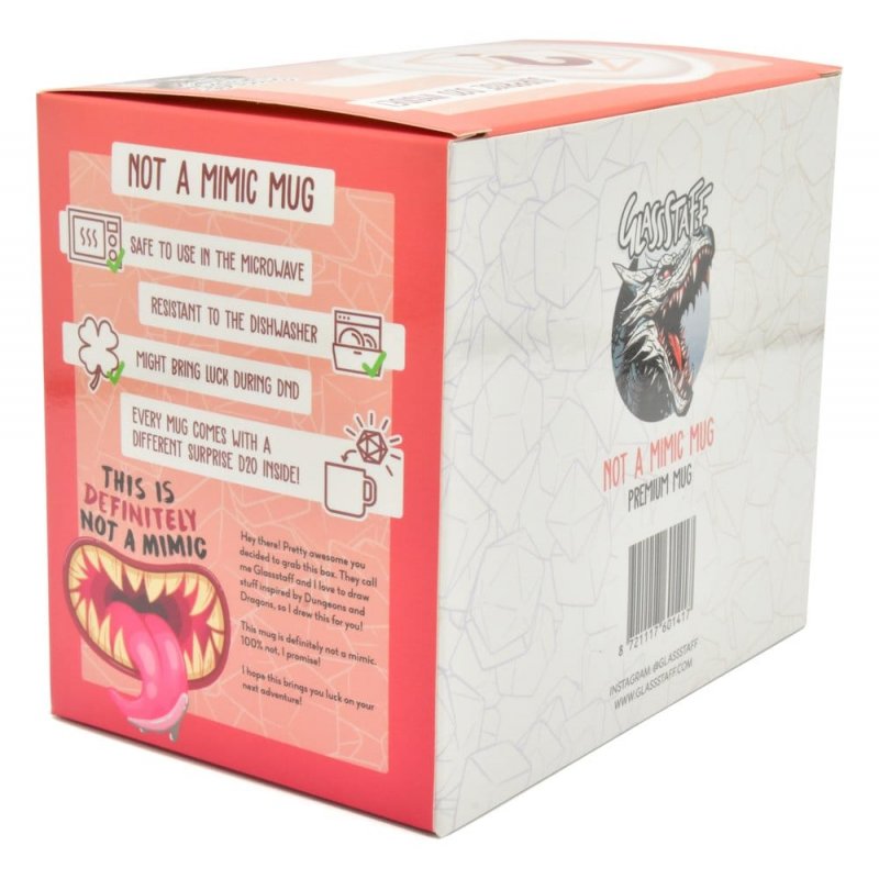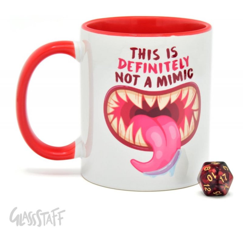 Oh, this is definitely not a mimic (Said every DM ever) Dare to take a sip out of these mimic mugs? Careful though, it can possibly result into a common phrase Dungeon Master's use: ""Roll Initiative."" But we promise you. This is definitely NOT a mimic.This DnD mug is perfect for coffee, tea and hot chocolate during those intense DnD sessions!! The mug is printed with High quality sublimation printing, which makes it an appreciated gift to every true hot beverage lover. The design is printed on both sides of the mug, so you and your party members can enjoy it!This mug is especially crafted with the idea to be gifted to you, your party members, friends and family. Along with a little gift of a D20 in every mug, you will be able with every enjoying moment of your drink to; Roll for initiative.Presented in a decorative Window Box, the Mug is made of Ceramic that makes it Dishwasher as well as Microwave safe.