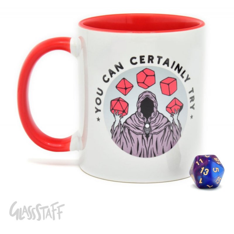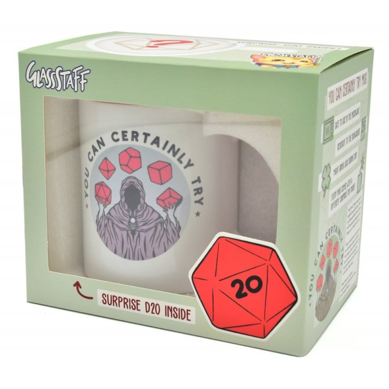 When the DM says: ""You can certainly try"" It is the sentence we players fear and the sentence that will not intimidate us to still try. Or maybe it will when it is followed with a "" Are you sure?"". We experienced it all and we've got the design for both players and dungeon masters. To show the players and intimidate a little, or for the players to raise their glass and try it anyways.This DnD mug is perfect for coffee, tea and hot chocolate during those intense DnD sessions!! The mug is printed with High quality sublimation printing, which makes it an appreciated gift to every true hot beverage lover. The design is printed on both sides of the mug, so you and your party members can enjoy it!This mug is especially crafted with the idea to be gifted to you, your party members, friends and family. Along with a little gift of a D20 in every mug, you will be able with every enjoying moment of your drink to; Roll for initiative.Presented in a decorative Window Box, the Mug is made of Ceramic that makes it Dishwasher as well as Microwave safe.