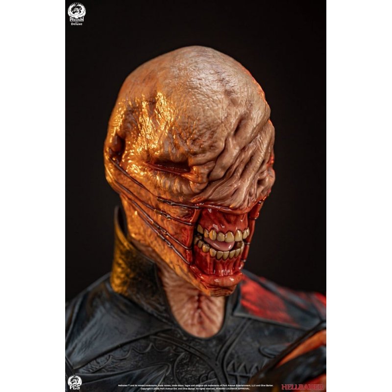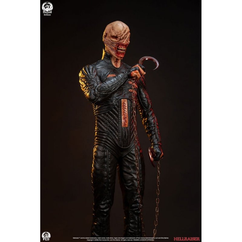 Premium Collectibles Studio is proud to present the Chatterer 1:3 Statue based on the chilling Cenobite from the classic horror film, Hellraiser.Standing approximately 76,2 cm tall, this fully sculpted resin statue is hand painted and covered in grotesque details.Chatterer is depicted in an intimidating stance brandishing a pair of grisly hooked weapons connected by a length of chain. Each blade, and the hands that hold them are covered in viscera.The many folds and scars that mark his face have been masterfully sculpted giving this interdimensional traveller an appropriately alien appearance.The only indication of his humanity being his teeth that are laid bare by the sharp hooks that pull from the sides of his mouth to the open wound on the back of his head leaving him with no means of communication other than his eponymous chatter.His leather like suit is recreated in great detail featuring otherworldly patterns decorating his form as well as cut outs that expose the viscous scars on his chest, abdomen and back.Chatterer stands atop a base modeled after the transformed version of the puzzle box, the key that opened the way for the Cenobites to enter our dimension.The Deluxe Edition also includes a swap out portrait with an open mouth and a swap out raised arm.Explore the furthest regions of experience and pick up the Hellraiser: Chatterer 1:3 Statue Deluxe Edition by PCS today!Size: 76.2 x 35.6 x 35.6 cm (30.00" x 14.00" x 14.00")