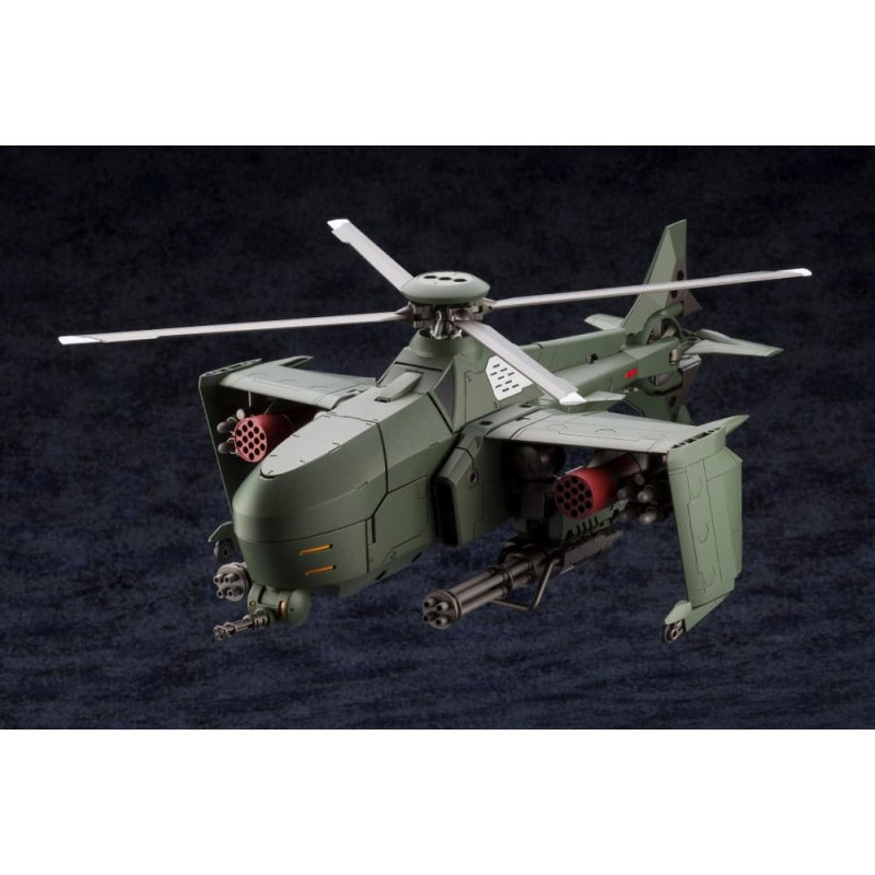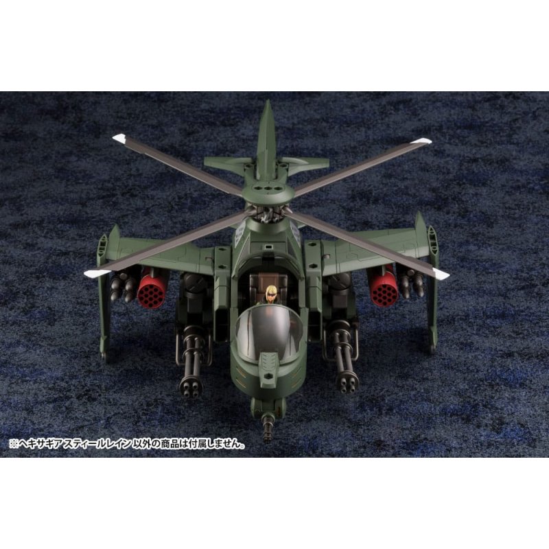 "STEELRAIN is a 2.5-generation variable HEXA GEAR with a rotary-wing aircraft configuration.Driven by the immense value of HEXA G-R.A.M and the crystalline reactors that triggered prolonged corporate warfare, humanity continued producing HEXA G-R.A.M in pursuit of profit-willfully ignoring the warnings of environmental control AI. As the resulting contamination of the soil worsened, the world's largest military-industrial complex, MSG, recognized the urgent need to end the conflict. As such, they began developing a new HEXA GEAR based on a new concept that would be intended to shift the tide of war. The completed unit came in two similar looking but vastly different variants. The early type was a rotary-wing aircraft-style HEXA GEAR with its power source replaced by a HEXA G-R.A.M-functionally similar to first-generation models. The later type featured a system that enabled transformation into a humanoid form. While the early type lacked any particularly unique features aside from being an increasingly rare aircraft-type, it earned high marks for reliability and ground attack capability thanks to its standard loadout of dual 20mm Gatling guns and a broad array of ballistic weapons. This, combined with the inherent advantage of aerial strikes, gave it a decisive edge over most second-generation HEXA GEAR units, which were primarily vehicle or biped-based.The later type further expanded its versatility. It incorporated a BMI control system and manipulator arms, allowing for rapid weapon swapping and supply handling. Its form-switching mechanism also enabled it to engage effectively in CQC on the ground. These features earned it classification as a 2.5-generation HEXA GEAR. However, its production cost ballooned to the equivalent of several BULKARMa units, making it one of the most expensive machines of its generation. Operationally, its fragile airframe required constant maintenance, and its high ammunition consumption demanded a steady supply chain-necessitating support from advanced ground crews, far beyond what typical Governors could handle. Its high performance also came with an extreme energy demand. Even just powering the main rotor required a massive amount of HEXA G-R.A.M-several times more than most other second-generation units. This was the price paid for its ability to transport heavy cargo, including other HEXA GEAR, but was especially burdensome in the later type, which had additional weight from its form-switching mechanism. As a result, some units opted for the earlier type instead, prioritizing efficiency and sustainability over versatility.Despite its drawbacks, the deployment of STEELRAIN units consistently delivered decisive results on the battlefield and their performance has been judged more than worth the high cost. However, the enormous strain they placed on resources were unbearable in the end-even for the mighty MSG military-industrial complex, which led to it becoming the butt of a joke: ""STEELRAIN might tear through enemy lines like a storm, but once it's back at base, it's the one left out in the rain."" Nevertheless, the STEELRAIN is still remembered as a HEXA GEAR that struck fear into the hearts of most enemies at the time, especially for those who faced the STEELRAIN units back then.The "rain of steel" appeared in the skies and silenced every single object crawling on the ground with a rainstorm of bullets.""Unidentified forces detected within MSG-controlled territory. Commencing elimination protocol.""Weapons:- 20mm Gatling Cannon - Anti-Aircraft Missile - Rocket Bullet Pod - Anti-Personnel Machine Gun - Iron FistModel Specifications:- This attack helicopter can be converted from "Vehicle Mode" into "Humanoid Mode". - The closed cockpit can be opened and closed, allowing a separately sold Governor unit to be placed inside. - The seat-unit inside the cockpit has a "reclining" and "sliding" feature to adjust to the size of the models being placed inside. - This highly detailed cockpit has two types of adjustable levers and adjustable foot pedals installed so that users can fully enjoy arranging the outstanding Governors embarking/disembarking the helicopter. - The rotating propellers can be freely rotated and the blades folded. - The "armored windbreaker" includes the two types: the internal head unit "back model" and the transparent canopy "front model" for users to select from. - The included "20mm Gatling Gun" can be taken apart and used separately similar to the Heavy Weapon Units. Also, it is compatible with the M.S.G Belt Links to enhance the overall firepower. - The included "air-to-surface missiles" can each be taken separately from the pylon. Also, the pylon can be expanded and missiles aligned. - By using the included attachments on the main unit and the HEXA-G.R.A.M. system, the included "rocket launcher" can be freely disassembled and expanded. It can also be used by pairing with the attachments that are used to raise the level of freedom for this model kit. - Compatible with the separately sold Flying Base Neo to create a dramatic display.Included items:- 1 x STEELRAIN Model - 2 x 20mm Gatling Gun - 2 x Air-to-Surface Missiles - 2 x Rocket Launcher - 2 x Rocket Launcher Expansion Parts Set - 1 x Archive Card(This item is a reproduction.)"