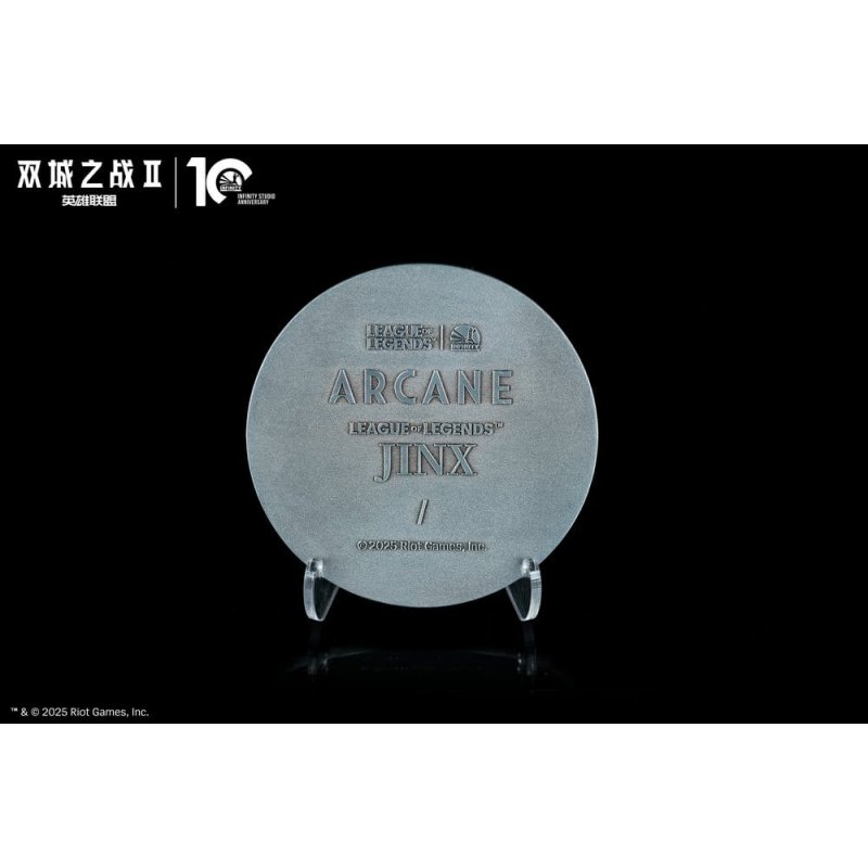 Powder grew up in Zaun with her sister Vi, always feeling like the weak link of the group. During a failed attempt to protect her family, a bomb she built caused a tragic accident that killed her friends and adoptive father, Vander. In the confusion that followed, Vi left her behind. That moment changed her forever.Later taken in by Silco, Powder was reshaped by his worldview and the influence of Shimmer. Over time, the wild and unstable side of her personality-"Jinx"-came to the surface. Silco showed her intense, almost unconditional acceptance, often telling her she was "perfect" and that he would never give her up.When Jinx finally reunited with Vi, she discovered Vi had grown close to the enforcer Caitlyn. Feeling replaced and unable to share Vi's affection, Jinx spiraled. In a tense showdown where Vi was forced to choose between the two, Jinx accidentally killed Silco in this chaos.With Silco's final words-"Don't cry. You're perfect"-Jinx fully accepted who she had become. She fired the Super Mega Death Rocket at the Piltover Council, marking the beginning of open war between the two cities.Product Details:Headsculpt:- Two interchangeable expressions: Calm and Angry, making it easy to dispplay as wish - The Angry head features light-up eyes (battery in the head) with removable effect parts - Facial details closely resembling the animation, including subtle veins and frecklesBody:- Skin texture follows the animated look - Detailed blue cloud tattoos bring out Jinx's signature styleWeapons:- Weapons come with realistic weathering and hand-painted graffiti-style detailsPose:- Captures the explosive moment of Jinx firing her Pow-Pow gun, full of motion and attitudeBase:- Base design incorporates Jinx's iconic symbols - Backdrop includes three lighting modes: constant, breathing, and strobe (AC powered) - Includes a separate stand for displaying the extra headsculptCertificate:- Comes with an exclusive metal nameplateWith LED light function.Power Source:- Adapter 5V2A - 3 x LR621It measures approx. 60 x 53 x 43 cm and comes in a printed box.Limited to 797 pieces worldwide.Please note: Due to the small edition size and the great demand for this item, allocations are possible.