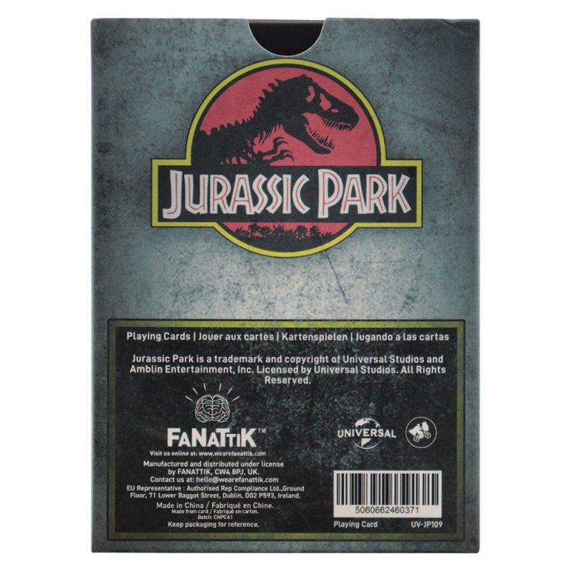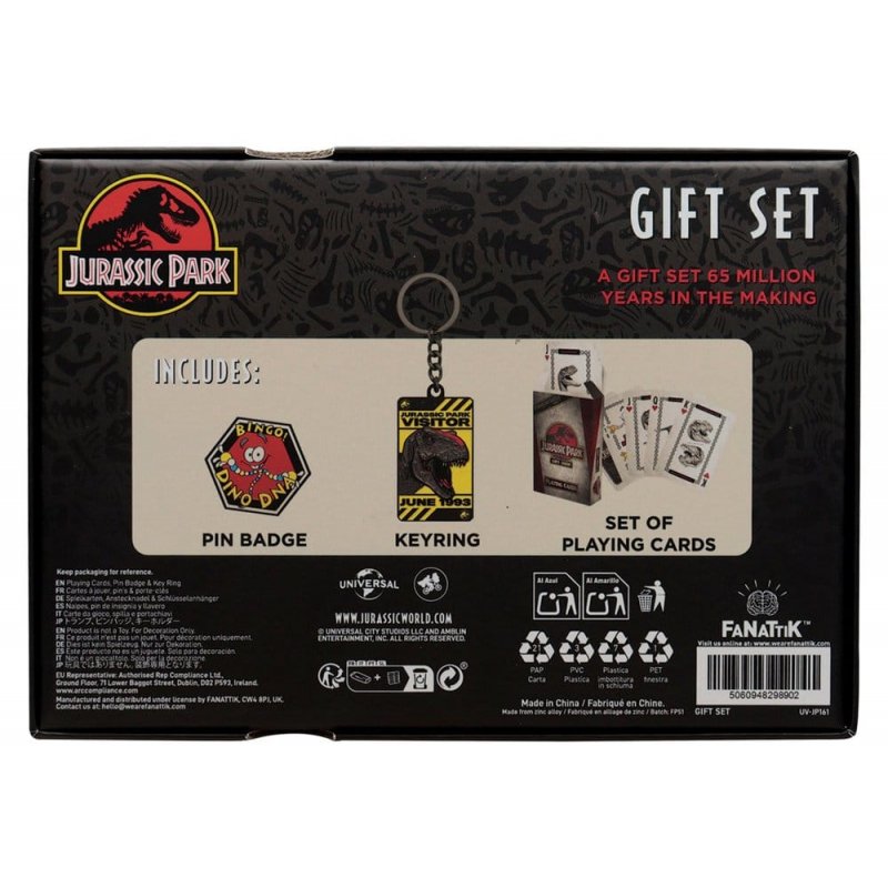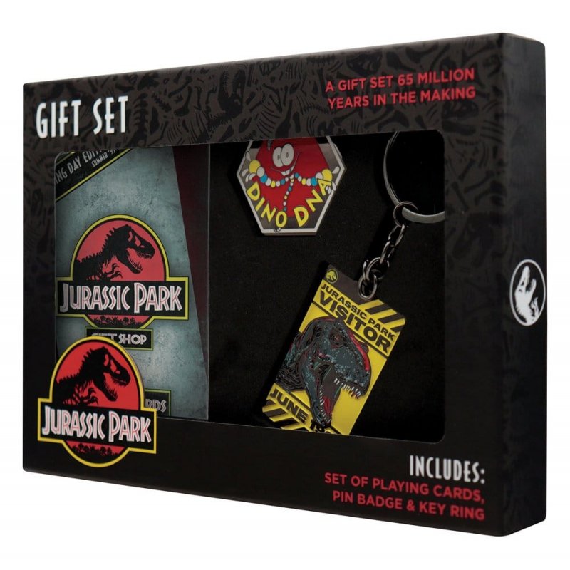 "A gift set 65 million years in the making! This dino-themed set is perfect for any budding explorer, park enthusiast, or fan of the films. Inside the gift box you'll find a metal Jurassic Park keyring styled like an authentic park visitor pass, a Mr. DNA pin badge bringing a touch of scientific charm, and a deck of Jurassic Park playing cards featuring unique dinosaur artwork and vintage park-inspired graphics.Perfect for movie lovers, dino devotees, or anyone who still feels a shiver of excitement at that first "Welcome to Jurassic Park" reveal, this set delivers a nostalgic present packed with a lot of dino spirit.- Officially licensed - Trio of matching items - Gift box measures 190 x 160 x 25mm - Playing cards pack, keyring, and a pin badge included"