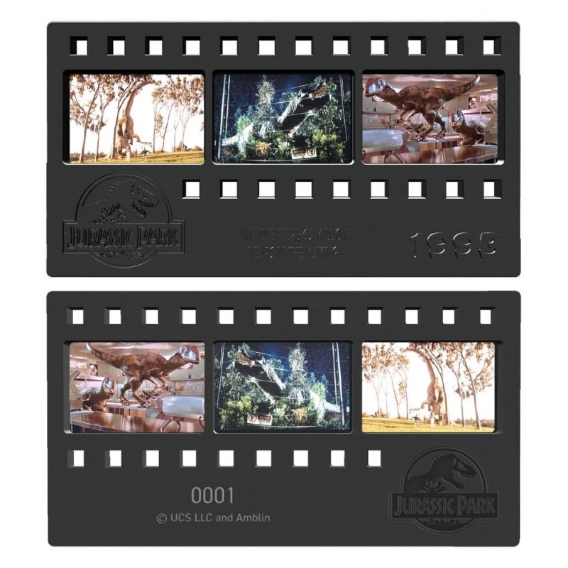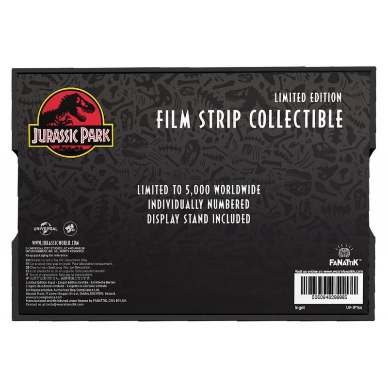 Featuring three of the most iconic scenes from the one of the most iconic films of all time, this limited edition metal film strip replica depicts the brachiosaurus standing on its hind legs to reach the high leaves, Dr Grant waving the flair to distract the T-Rex from the children trapped in the upturned Jeep, and Tim hiding from the hunting raptors in the kitchen. Individually numbered to the reverse as one of 5,000 worldwide, the ingot comes with a display stand is finished with a dyed black plating.Size: 16 x 120 x 4 mm.