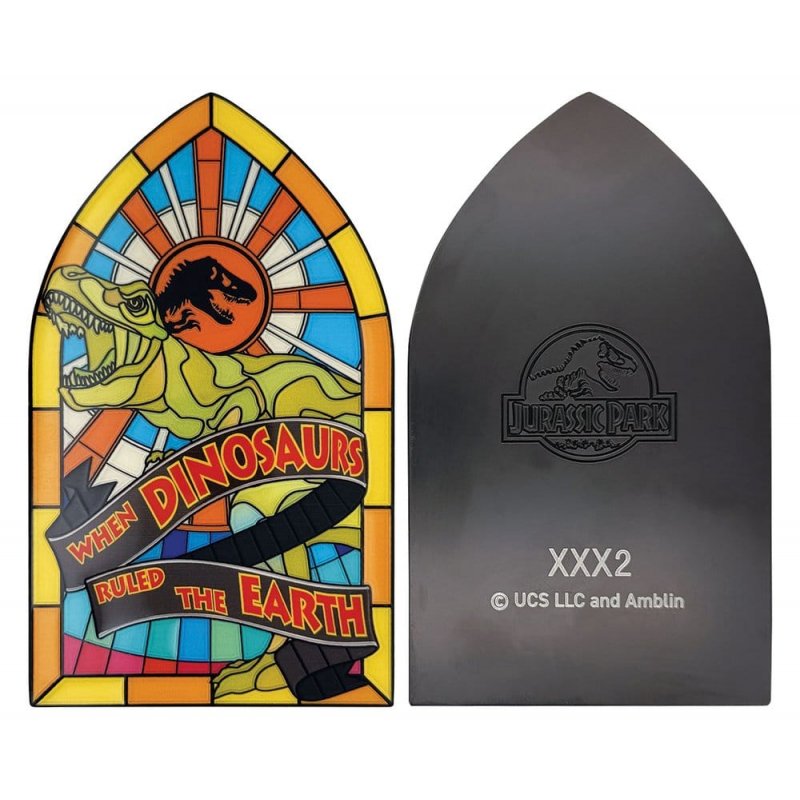 “WHEN DINOSAURS RULED THE EARTH” – the famous banner from the lobby of the Jurassic Park Welcome Center, which falls from the ceiling as the T-Rex roars, having saved the heroes from the attacking raptors, the scene of which is depicted in this limited edition stained glass-style metal ingot. Limited to 5,000 worldwide, the ingot is individually numbered to the reverse and features vibrant colours on the front.Size: 110 x 64 mm.