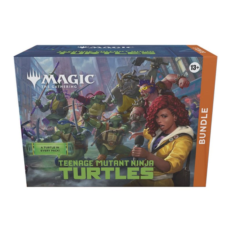 Magic: The Gathering gets a quadruple dose of mutagenic mayhem as the Teenage Mutant Ninja Turtles make their debut on the battlefield! Collect, construct, and combat with an iconic roster of allies and enemies from four decades of time-tested Turtle-mania. Get the drop on Shredder's goons with the all-new sneak mechanic, then enhance your team's strength with Mutagen tokens to rise triumphant like the true heroes of New York!The Bundle is a great gift for Magic superfans and newcomers alike. It contains a little bit of everything to get a player's collection off the ground, plus an oversized Spindown™ life counter themed after the set.Contents:9 Magic: The Gathering Play Boosters 15 traditional foil basic lands (with 5 featuring full art rooftop basic lands) 15 non-foil basic lands (with 5 featuring full art rooftop basic lands) Oversized Spindown life counter Card storage box 2 reference cardsPlease note: For this item, demand is expected to be higher than the available quantity, which may result in allocations or cancellations of quantities ordered.Please note that we can only ship release items on time for the release date if the net value of your release order exceeds the valid postage allowance for your destination country.