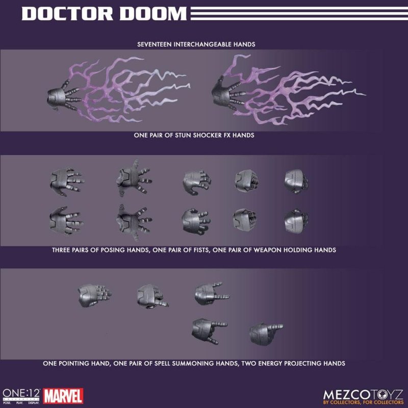 "Doom is no man's second choice."The Latverian monarch, Doctor Doom, joins the One:12 Collective!Doctor Doom wears a hooded tunic and a suit of armor made with real metal components. His removable cape features a clasp, real metal chain, and integrated posing wire. He comes with 2 interchangeable unmasked heads and 3 interchangeable faceplates allowing for a variety of distinct looks.Doctor Doom wields the Cosmic Power Siphon Harness which features a light-up function. The harness connects securely to his armored suit and allows him to drain cosmic energy from beings with great power.The master of science and sorcery comes complete with his signature electro-shock weapon which fits neatly in the holster on his belt, a hinged spell book with printed pages, interchangeable rocket thrusters that attach to the back of his armored suit, and much more.After overcoming his difficult childhood, Victor Von Doom went on to become one of the world's most brilliant scientists. The combination of his towering ego, scientific genius, and unquenchable lust for power have allowed him to become one of the greatest villains in the Marvel Universe.Each One:12 Collective Doctor Doom figure is packaged in a collector-friendly box, designed with collectors in mind.
