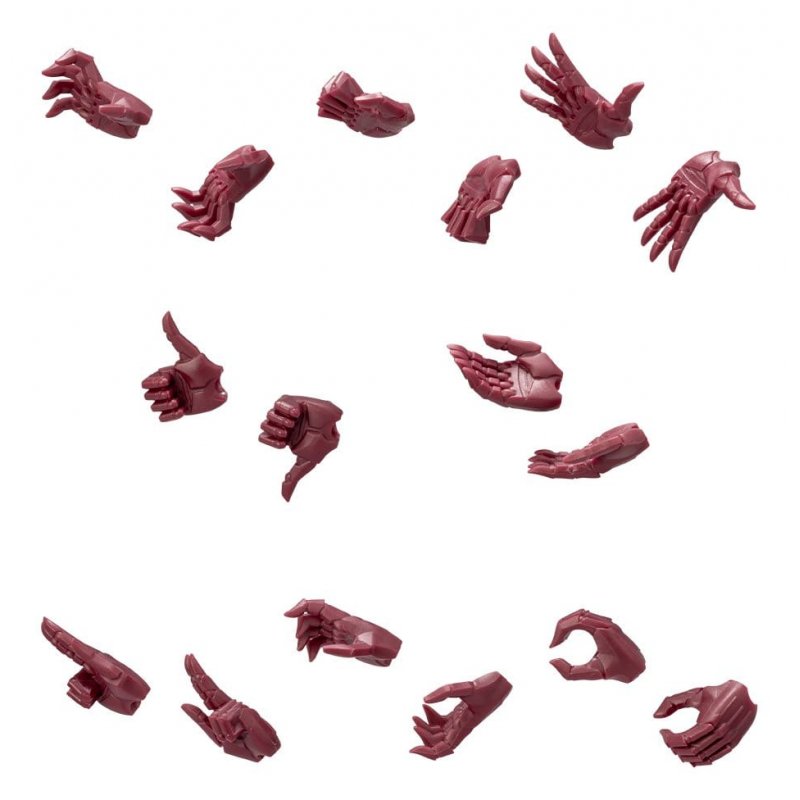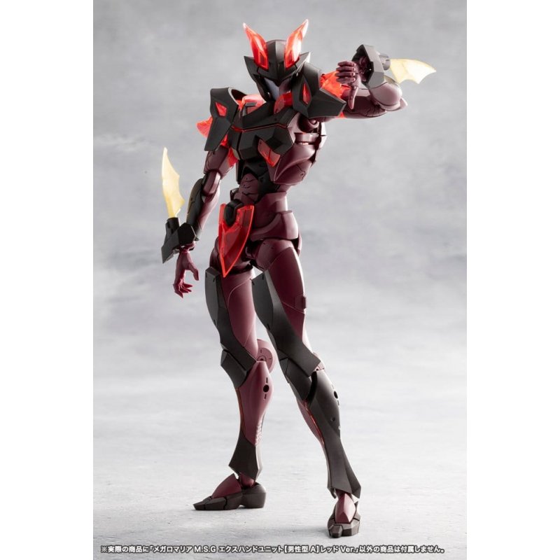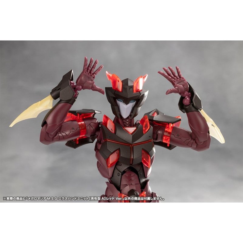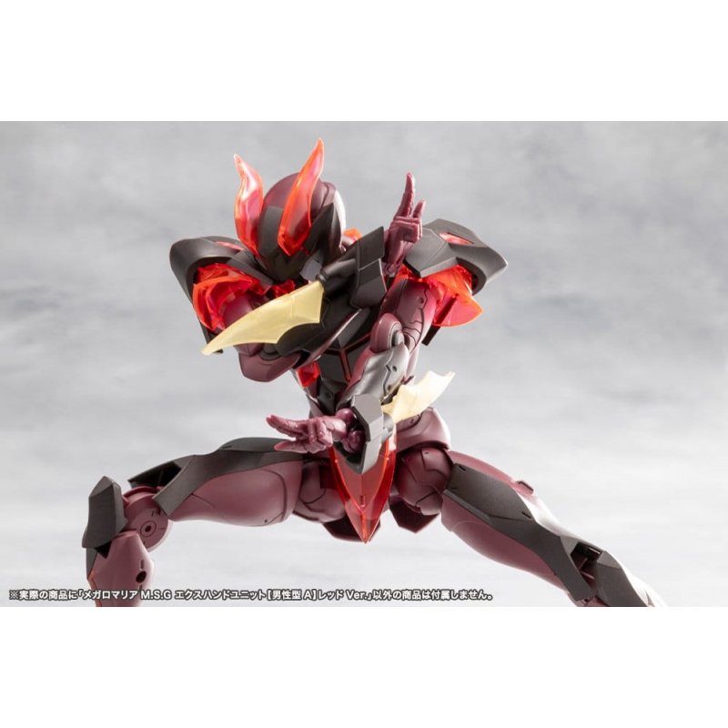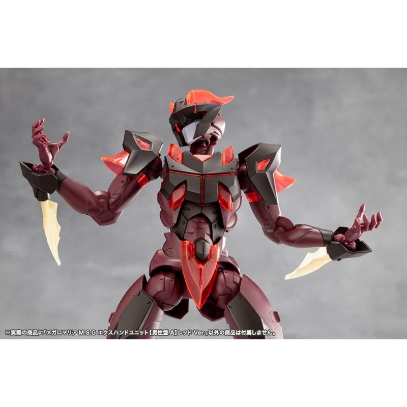 "This is a color variation kit that changes the molding color of MEGALOMARIA M.S.G EX HAND UNIT [Male Type A] to red to match Mephisto. *This product is not part of the TOKYO Mark brand.5mm Holding Hand: This part can hold thick pipes of around 5mm and is great for recreating a variety of scenes, such as where the arm or ankle of an enemy is held when applying a lock.Fighter Stance Hands: This is an essential part for striking powerful poses, such as a fighter's stance when they open their hands. It is also possible to recreate action scenes like grabbing the opponent's face or gathering power.Palm Strike Hands: Recommended for strikes that are somewhat different from punches! Also great for releasing gathered energy in one deadly move.Open Hands: These hands can fit snugly against flat surfaces, and allow for poses like being summoned, having hands pressed against a wall, and even handstands.Thumbs Up: This part is recommended for gestures typical of hot-blooded heroes.Hand Seal: A recommended part to give any look a lot of character, such as for ninjas or onmyouji.Supporting Hands: A powerful part perfect for quiet scenes such as lifting something or gently caressing a person's face. Recommended for poses when interacting with the Sousai Shoujo girls!Grabbing Hands: While not quite a tight grip, this part is recommended when grabbing onto something. Use it in such scenes as grabbing onto objects thicker than a weapon handle, such as a character's arm.Included Items: Eight Types of Hand Parts (Left and Right) 5mm Holding Hand, Fighter Stance Hands, Palm Strike Hands, Open Hands, Thumbs Up, Hand Seal, Supporting Hands, and Grabbing Hands"
