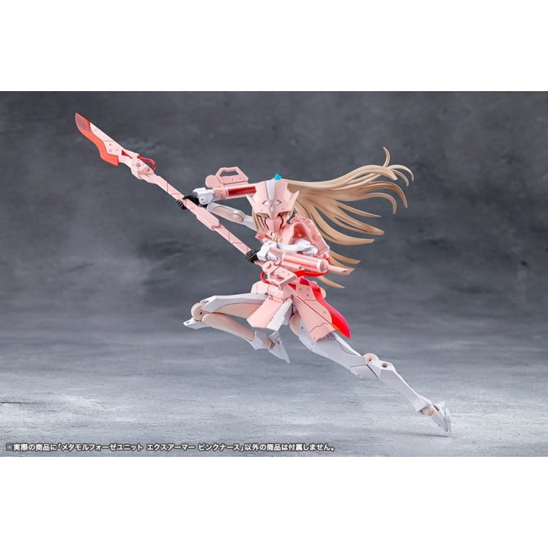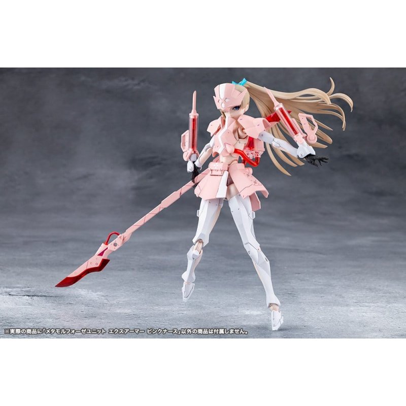 This kit is a color variation kit of Metamorphose Unit Exarmor White Nurse that changes the molding colors used while also adding Expansion Skin Parts and a headgear with a 0.3cm connection point. This optional set of items features an expansion armor based on the concept of a nurse outfit with weapon units based on medical tools. Expansion Skin Parts: The expansion skin parts, which have received a large response since their announcement, have also been included to increase compatibility with female-body type plastic model kit series, such as Sousai Shojo Teien. The parts use the pale Skin Color C, which matches well with Sousai Shojo Teien's Kuon Yakushiji [Maria Kagaribi Costume]. Headgear with 0.3cm Connection Point: The bangs part (headgear) features the same structure as Valiant, with a 0.3cm connection point in the center, and can be decorated with various parts. The color matches the beige used in Valiant and Emulator. The structure of the bangs part is the same as that used in Sousai Shojo Teien characters and can be freely interchanged. *Due to design limitations, the headgear is not completely compatible with all products. Scalpel: Includes two scalpel-like swords that can be connected using the included connector part to create Double-Bladed Mode. Injector: Includes syringe-like weapons that are able to be connected to the hardpoints of the marionnette style forearms. Unfolding the grips allows them to be used as handheld weapons. EXARMOR PINK NURSE: The expansion armor skirt features a 0.3cm joint on each part and consists of. Lifeblood Tank: The Lifeblood Tank, equipped to the back of the model, is based on a blood transfusion pack and has been beautifully molded with clear colorless and clear red plastic. Lifeblood Capsules: The four Lifeblood Capsules are molded in clear red and clear colorless plastic and can be attached to models using 0.3cm connection points. Two Types of Masks: Includes the two masks that came with Ruby Eye; one with an eyepatch and one with both eyes open. The masks can be used with Principal (sold separately) and Sousai Shojo Teien models (sold separately). *Regarding visor/mask compatibility: Sousai Shojo Teien's Ao Gennai and Bukiko Kotobuki use unique standards so they are not compatible with Ruby Eye.Included Items: - 1 x Exarmor Pink Nurse Set - 1 x Mask (Eyepatch) - 1 x Mask (Both Eyes Open) - 2 x Scalpel - 1 x Double-Bladed Mode Connection Part - 2 x Injector - 4 x Lifeblood Capsule - 1 x Expansion Skin Parts Skin Color C Set - 1 x Headgear with 0.3cm Connection Point