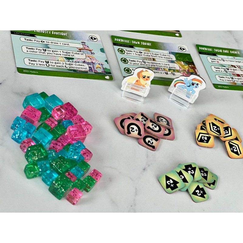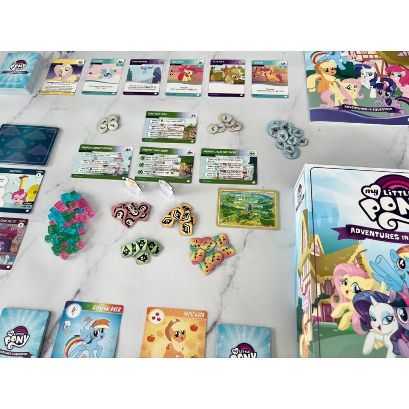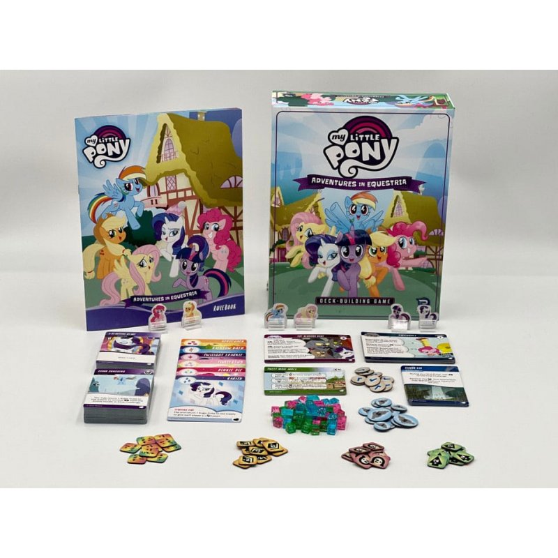 Canter into the My Little Pony - Adventures in Equestria, a cooperative Deck-Building Game, and take the role of a pony of Equestria!As Twilight Sparkle, Rainbow Dash, Fluttershy and more, you've been given a challenge to complete! You'll need to travel amongst different locations throughout Ponyville, get new cards to improve your deck, complete tasks for resources, and overcome obstacles. Watch out - if you take too long, clouds will build up over time and cause you to suffer setbacks in your quest. The ponies will have to work together using teamwork and friendship to win the game!Features:- A cooperative deck-building game! - Play as Twilight Sparkle, Rainbow Dash, Fluttershy, Rarity, Applejack, and Pinkie Pie - Gather allies, actions, and artifacts to improve your deck - Travel around Equestria to complete tasks and overcome the challenge!Contents Summary:- Over 130 cards including character, adventure, starter, and challenge cards! - 6 Standees - Assorted punchboard tokens - 45 Sugar CubesAt a Glance:- Number of Players: 1-4 - For Ages: 14+ - Playing Time: 45-90 min - Game Type: Deck-Building Game