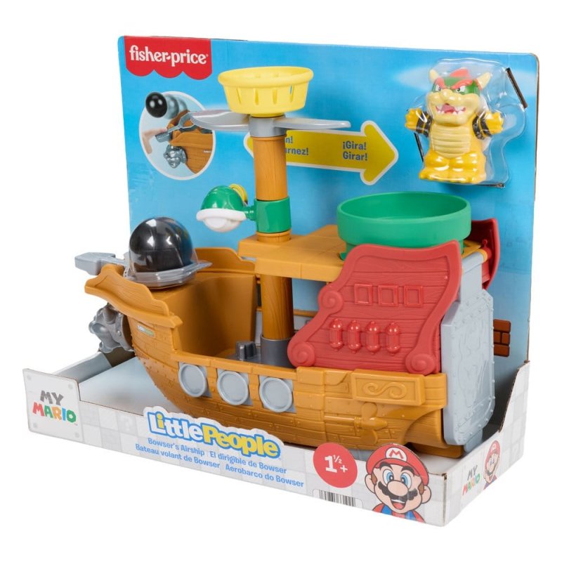 Toddlers can dive into the exciting world of Super Mario with this Little People My Mario Bowser Airship playset from Fisher-Price. Inspired by the legendary game, this push-along toy boat offers a wealth of fun activities designed especially for preschoolers. These include a cannonball launcher, propellers to spin and a trapdoor for playful tumbling. When children roll the vehicle, the Bowser Airship rocks up and down in a cool wave-like motion. There are also other Little People My Mario toys that are suitable for toddlers to play with. (Additional toys sold separately.) Colours and designs may vary.