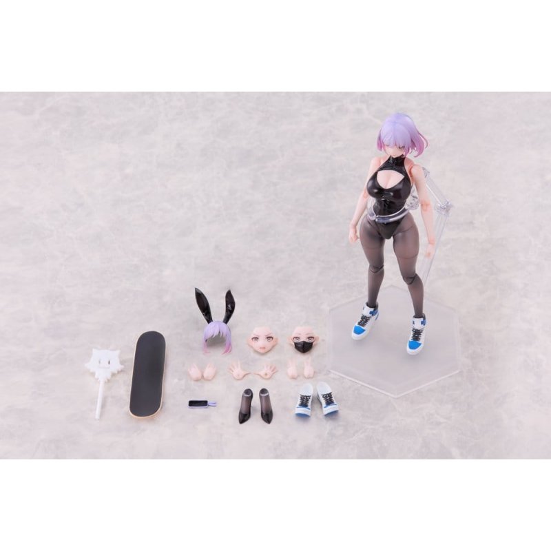 From Maden Illustrated ´Original Character´ comes this beautiful PVC statue. It comes with base in a window box packaging. Set Contents: - Main figure - 3 x face parts with fully adjustable eyes (Smiling, masked, blushing, default included) - 4 x sets of alternative hand parts (Default included) - 1 x set of alternative sneakers - 1 x set of alternative high heels - Alternative front hair part (w/Bunny ear hair band) - Smartphone - Skateboard - Stick for adjusting eyes - Clear stand set