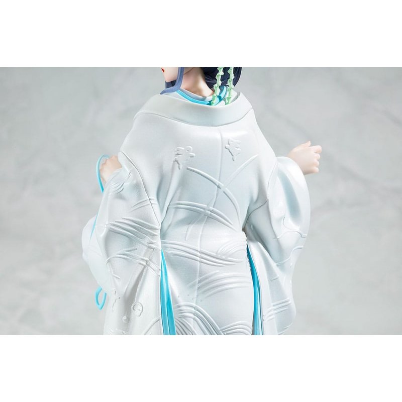 A figure is here depicting Sakurajima Mai from the Rascal Does Not Dream series clad in a White Kimono - a traditional Japanese bridal outfit. It is based on an illustration by Keji Mizoguchi, the illustrator of the original light novel series, and her elegant and sophisticated charm has been faithfully recreated. The figure captures Mai as she turns around showing the beautiful contrast of her pale nape and shiny dark hair. Her blushing cheeks are also adorable. The unique compositions and colors of the original illustration have been reproduced.The pure white outer kimono has a subtle pearl finish applied to create a glamorous appearance, and the beautiful ripple patterns have been recreated with semi-3D details. Add this special figure of Mai Sakurajima in her bridal outfit to your collection.