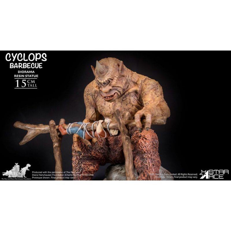 Introducing the stunning Star Ace Polyresin Diorama "Cyclops Barbeque," inspired by the iconic Ray Harryhausen classic, The Seventh Voyage of Sinbad. This meticulously crafted piece captures the thrilling moment when the fearsome Cyclops prepares to roast one of Sinbad's unfortunate crew members. Standing at 17cm tall, this diorama brings the legendary scene to life with exquisite detail and artistry. Perfect for collectors and fans of classic fantasy cinema, the "Cyclops Barbeque" is a must-have addition to your collection. Embrace the adventure and relive the magic of Harryhausen's timeless masterpiece!