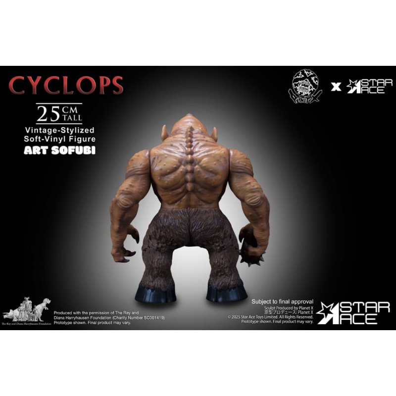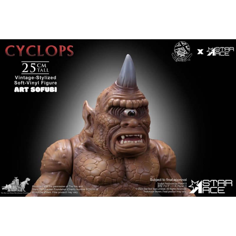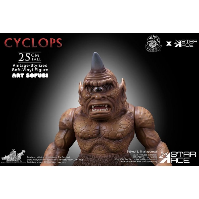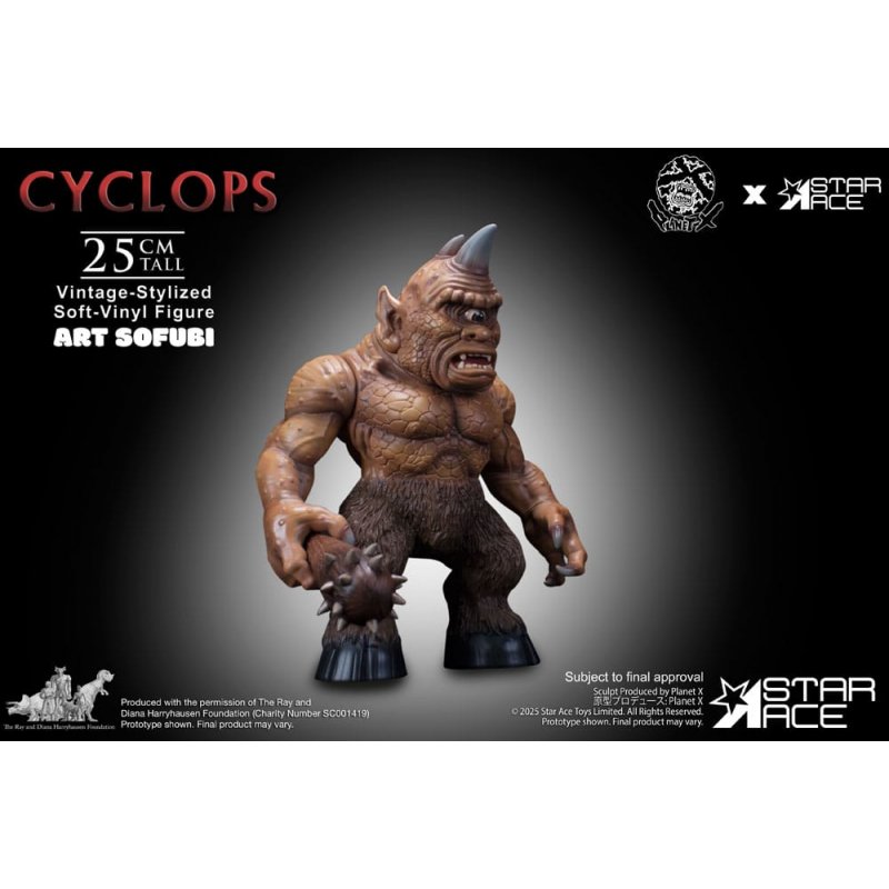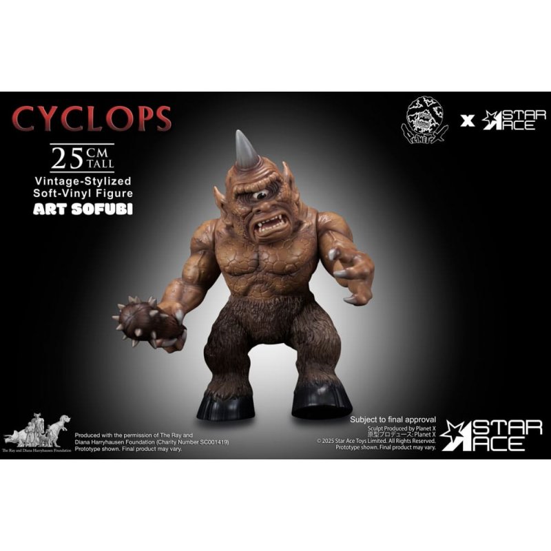 Star Ace expands its celebrated ART SOFUBI series with the mighty Cyclops from the 1958 adventure fantasy The 7th Voyage of Sinbad, licensed from the Ray Harryhausen Collection.Standing 25 cm tall and sculpted in the bold, retro-inspired style of Japanese sofubi, this figure channels the raw power and personality of Harryhausen's iconic one-eyed guardian. Featuring swappable heads-including both the single-horn and two-horn variations seen on screen-and a removable club accessory, this collectible offers display flexibility rooted in cinematic lore. Though designed with limited articulation in keeping with traditional sofubi aesthetics, its pose captures the creature's menacing charm.Finished with screen-accurate coloring and a textured paint application that highlights its sculpted detail, this Cyclops embodies the perfect fusion of vintage toy appeal and film history.Ideal for collectors of classic monsters, stop-motion enthusiasts, and fans of retro stylized art, the Cyclops ART SOFUBI figure is a formidable tribute to a mythic legacy.Confront the legend. Own the Cyclops.